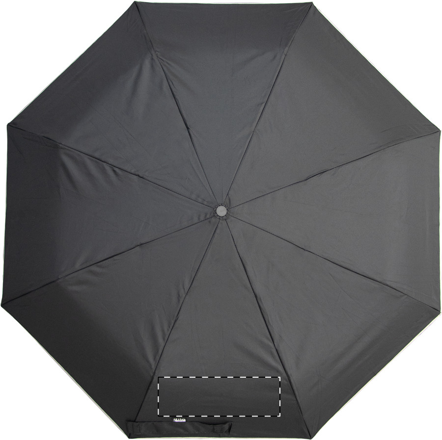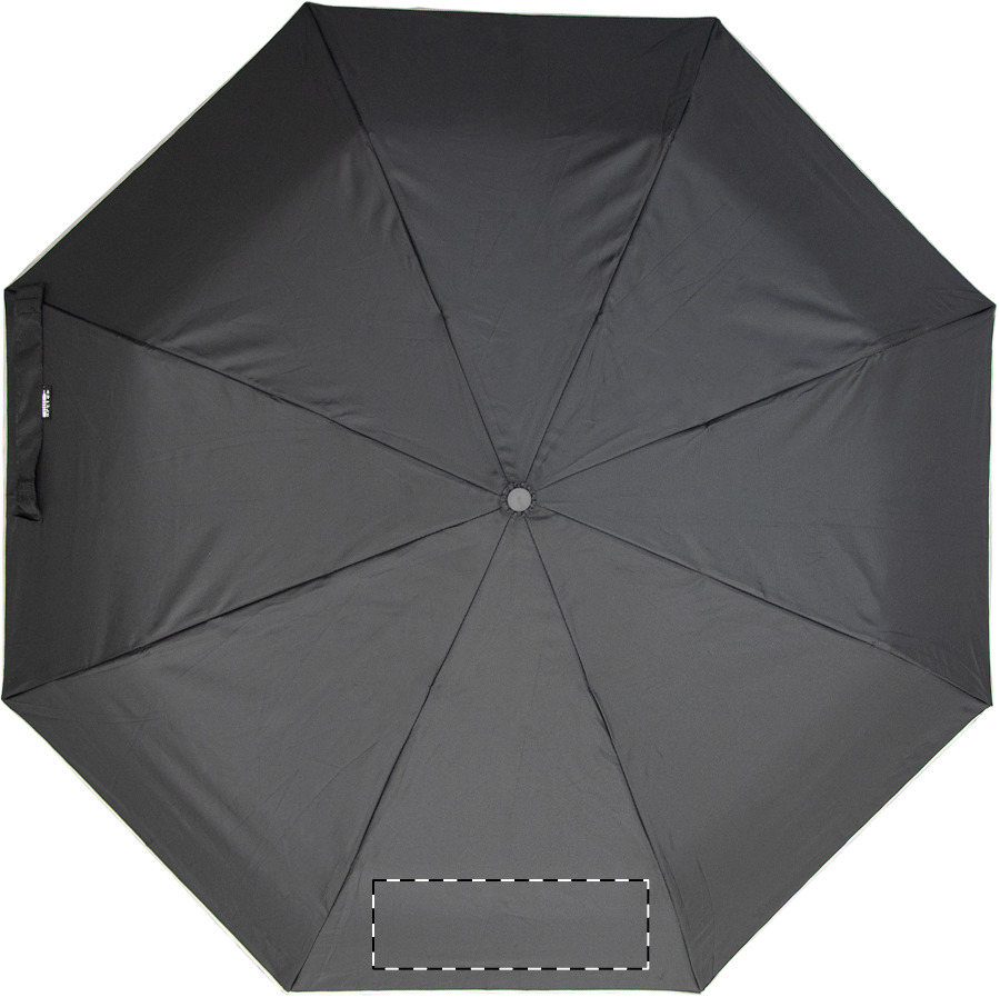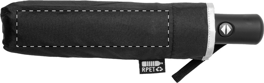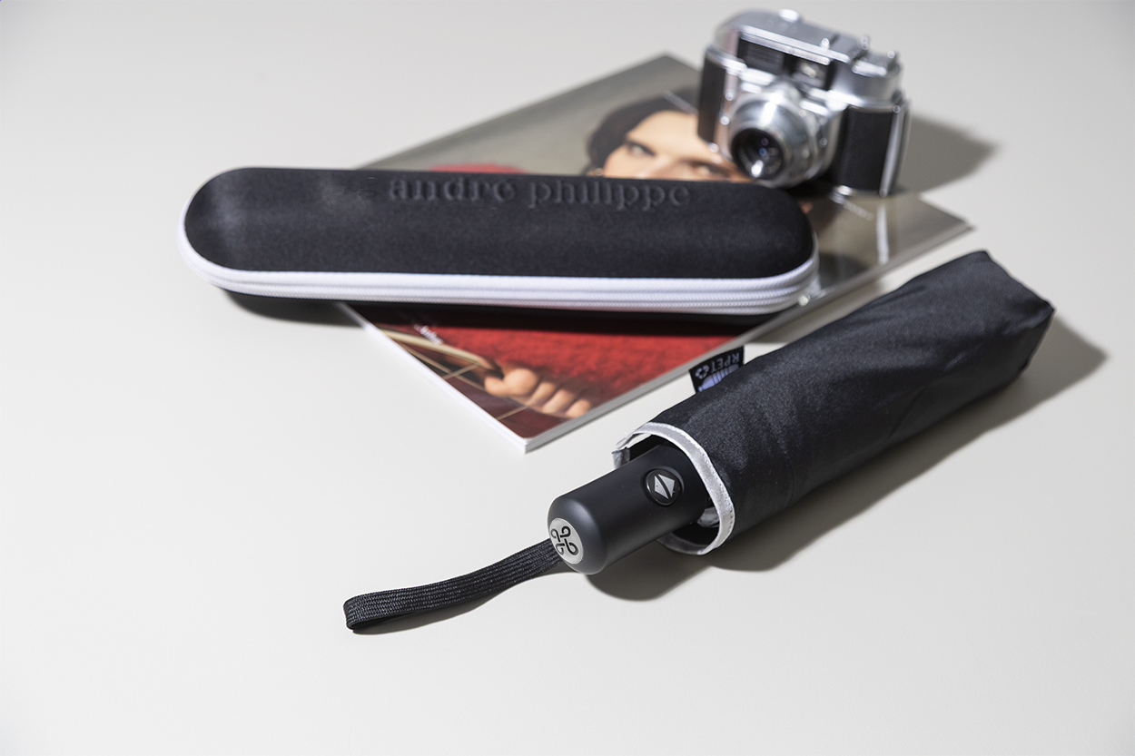 Teljesen automata (nyitás/zárás), szélálló, összecsukható esernyő 8 panellel, ezüst díszítéssel. Fém vázzal, üvegszálas bordákkal, gumírozott fogantyúval, csuklópánttal és hordtáskával. 190T RPET pongee. Megkülönböztető RPET címkével. Márkás, cipzáras, kemény tokban. André Philippe márkatermék.