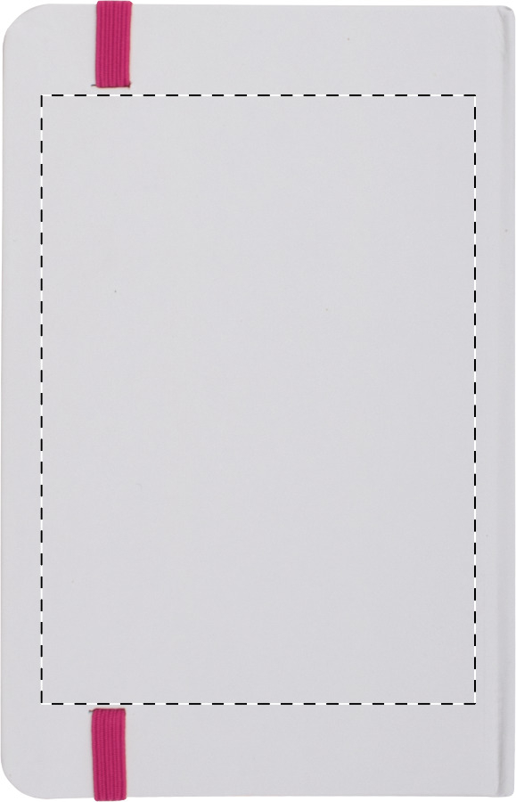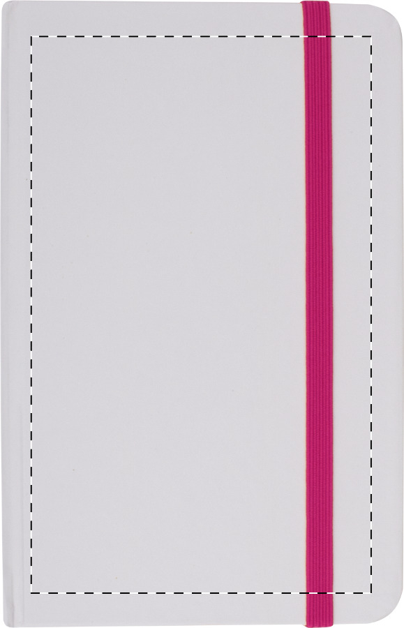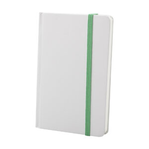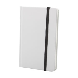 Fehér kartonpapír borítású jegyzetfüzet 80 sima lappal, színes gumipánttal zárható. A6 méretű.