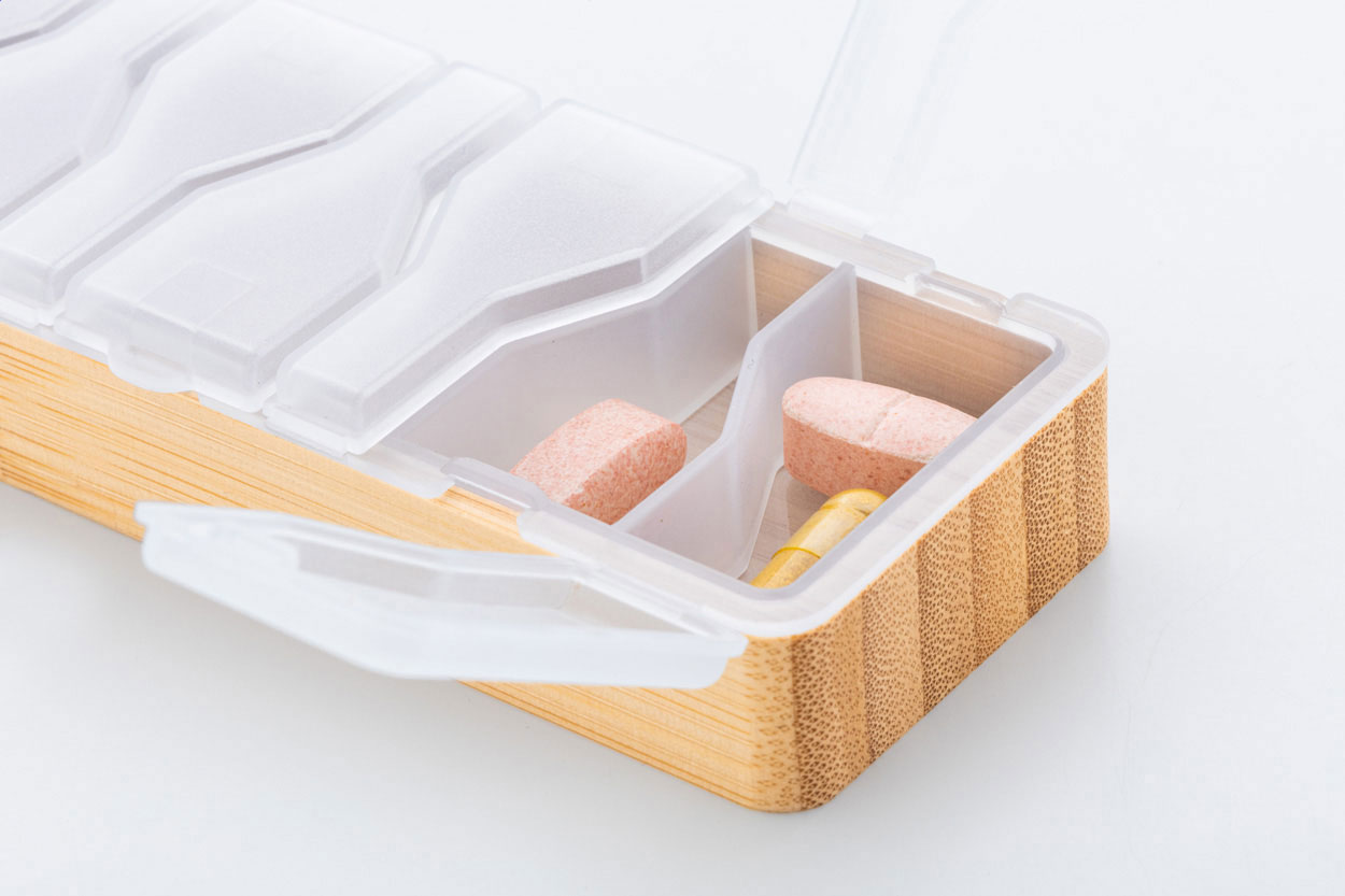 Bambuszból és újrahasznosított PP-ból készült gyógyszeradagoló egy hétre felosztva.