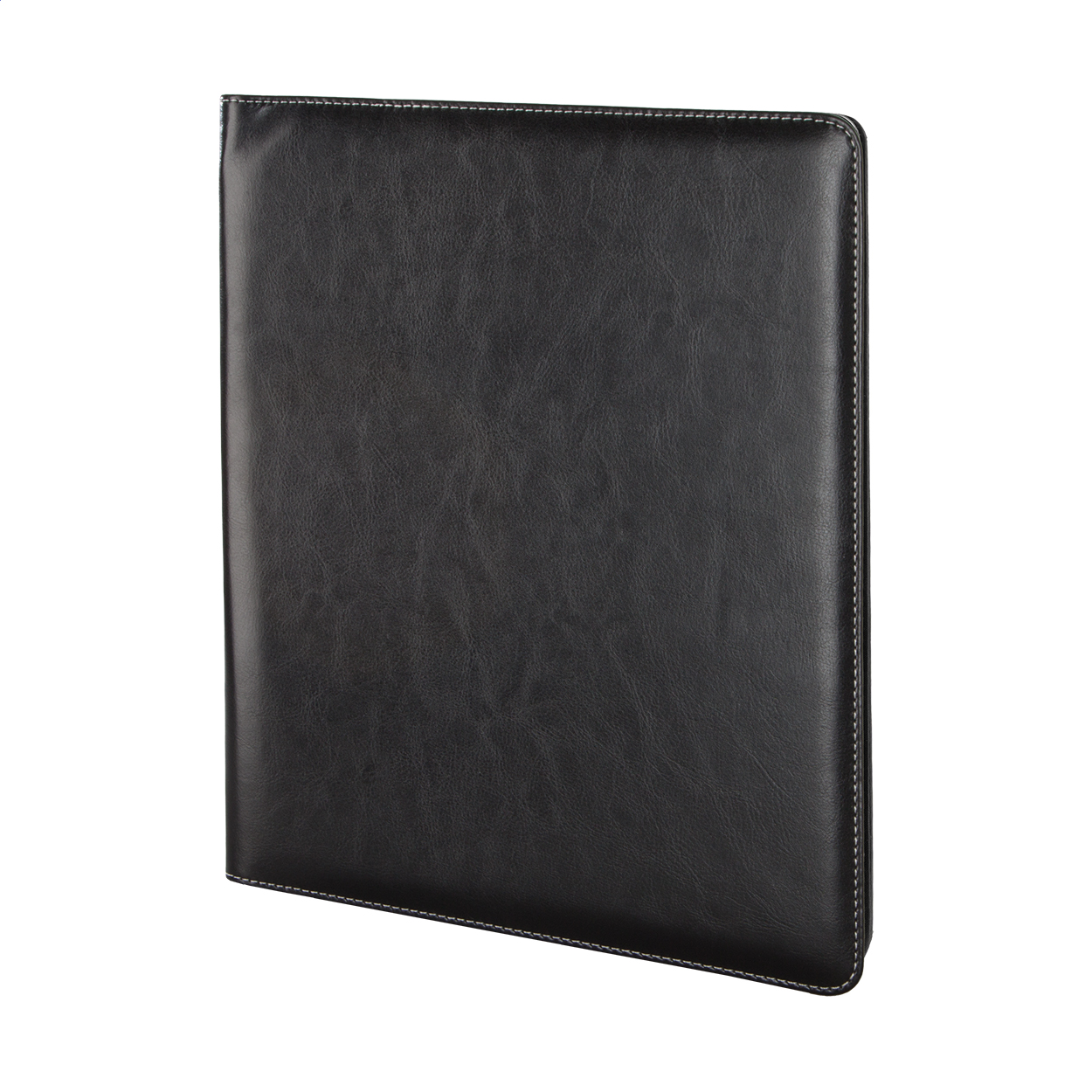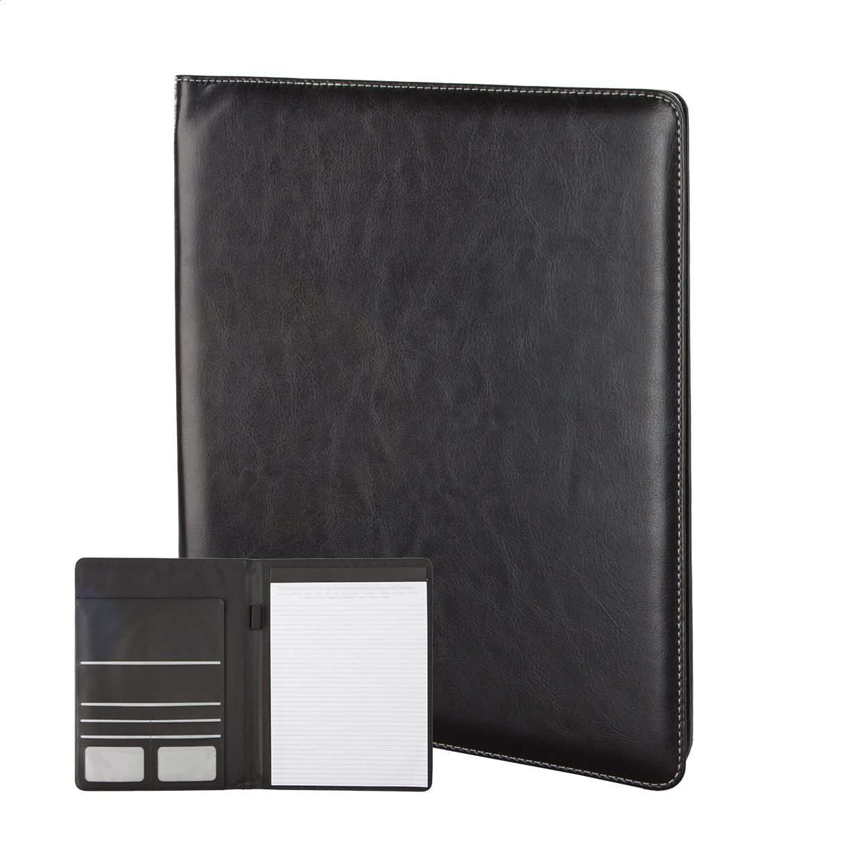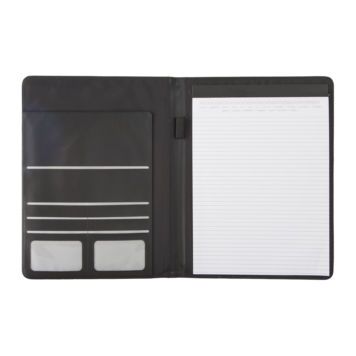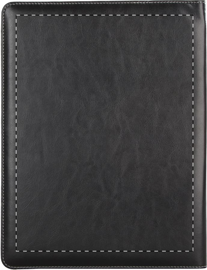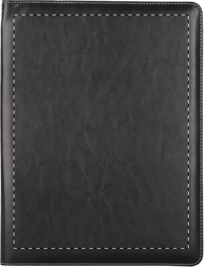 A4-es méretű, PU bőr iratmappa 20 lapos vonalas jegyzetfüzettel, toll- és névjegykártya tartóval.