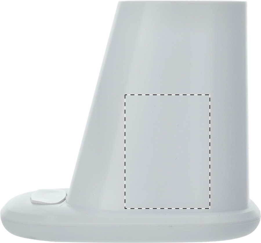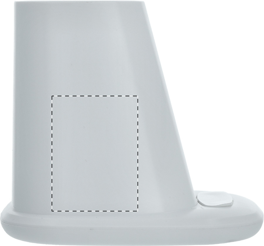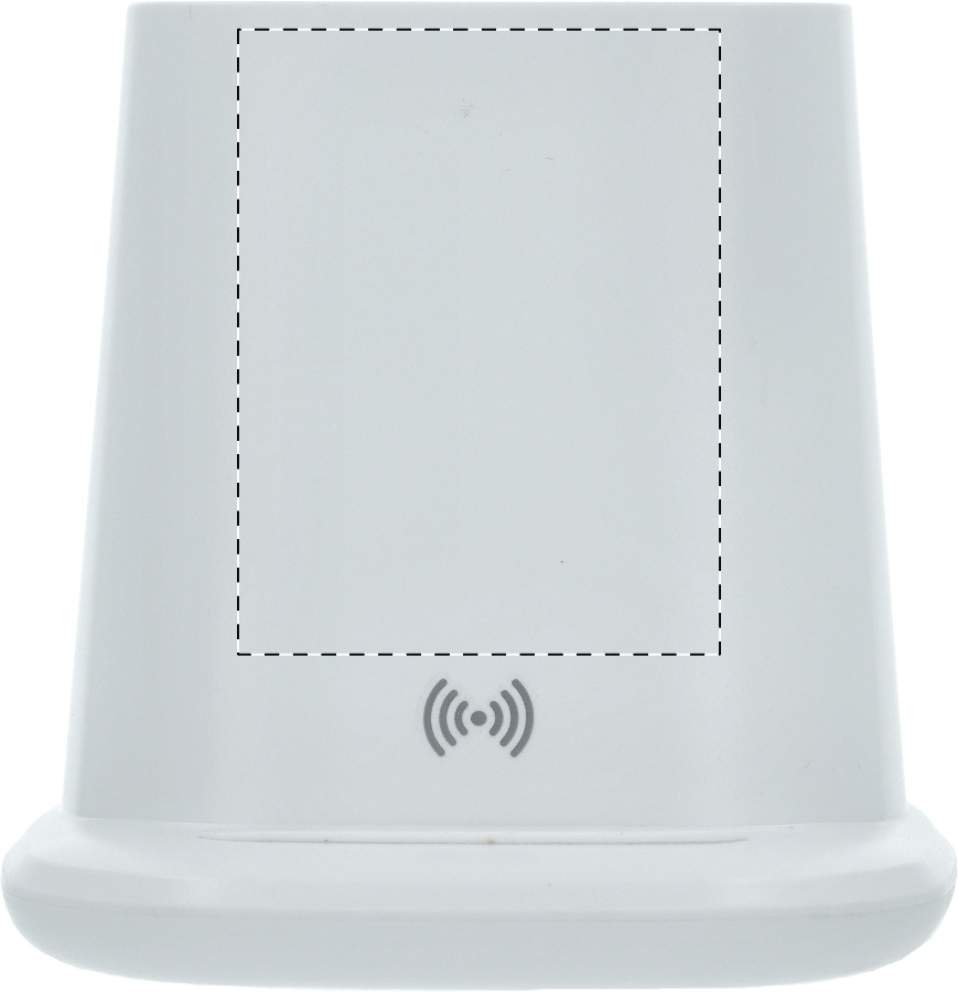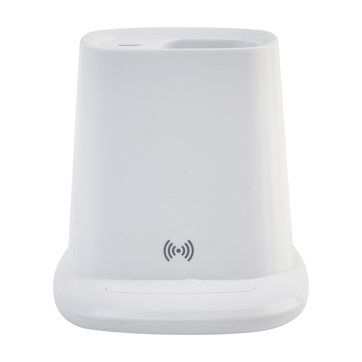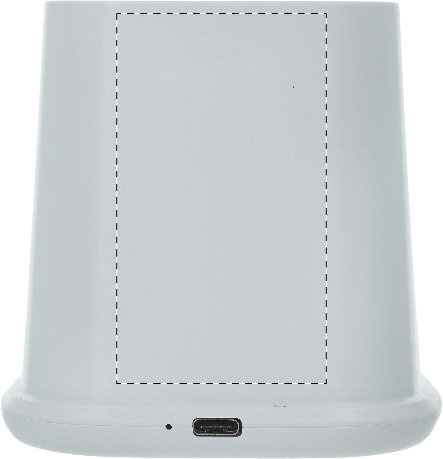 Újrahasznosított ABS multifunkcionális asztali tolltartó mobiltartóval, beépített vezeték nélküli gyorstöltővel (10W), 1 USB és 1 USB-C töltő porttal. USB töltőkábellel.