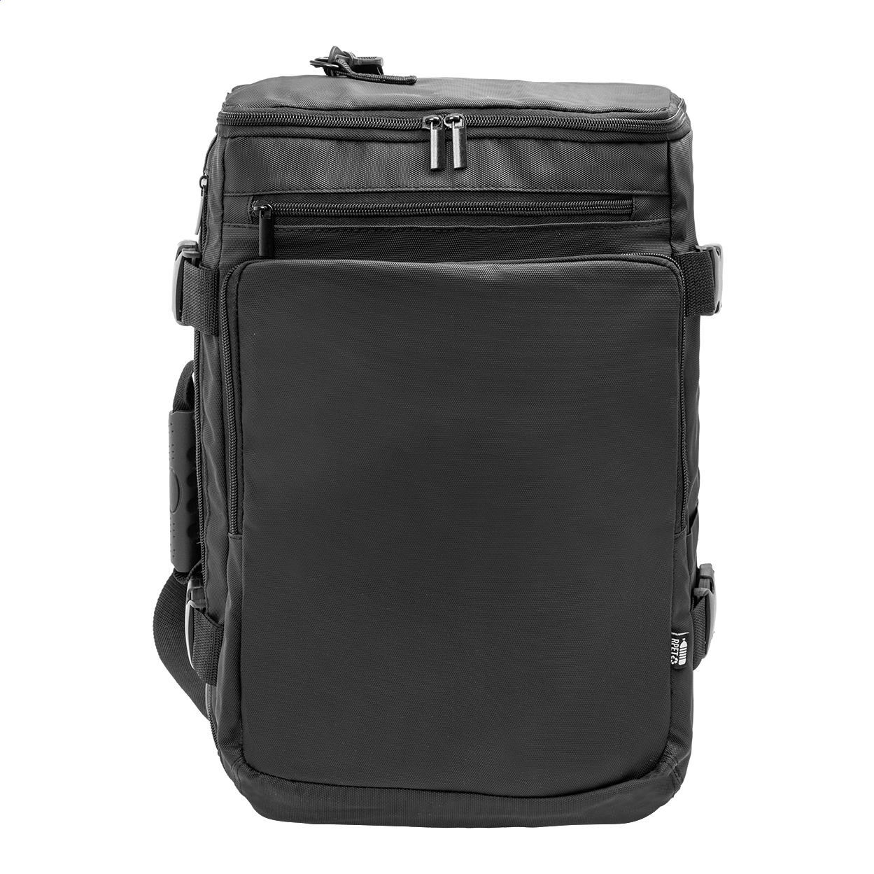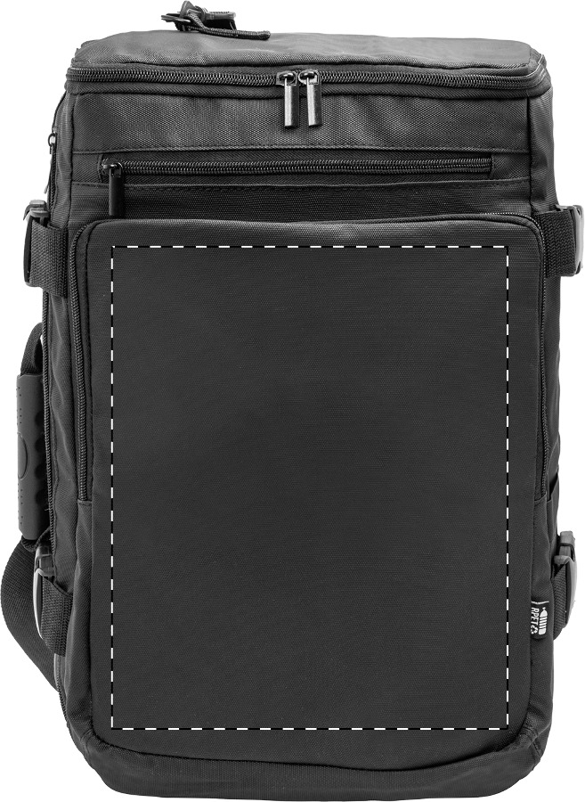 Vízálló, kétfunkciós RPET dokumentum hátizsák cipzáras fő rekesszel, két cipzáras elülső zsebbel, oldalsó zsebbel, oldalsó csatos pántokkal és párnázott laptop rekesszel (15"-os). Párnázott hátrésszel és levehető vállpántokkal. Tartalmaz egy további levehető vállpántot, amely irattáskaként is használható. PU bevonatú 600D RPET poliészter, megkülönböztető RPET címkével.