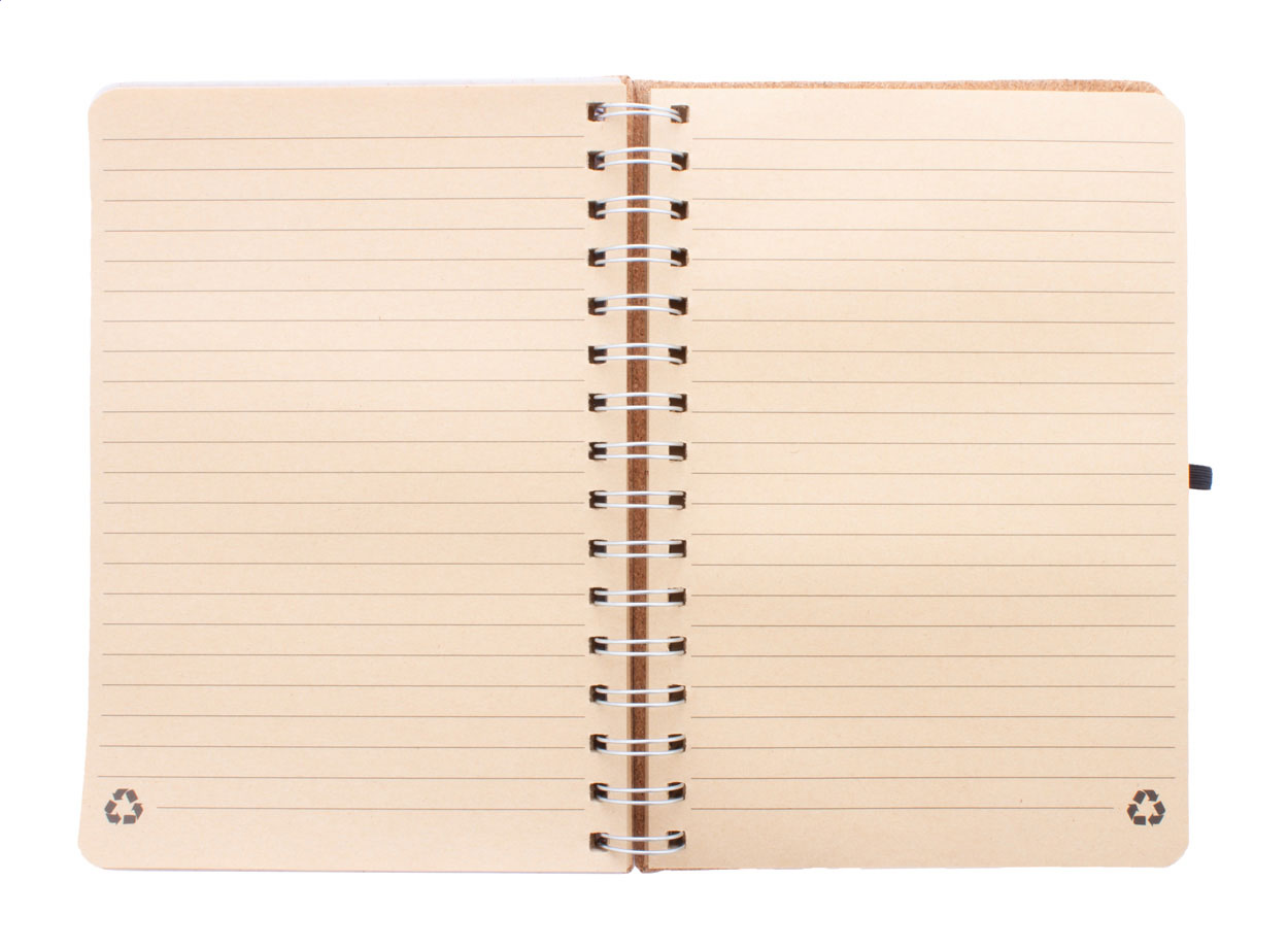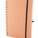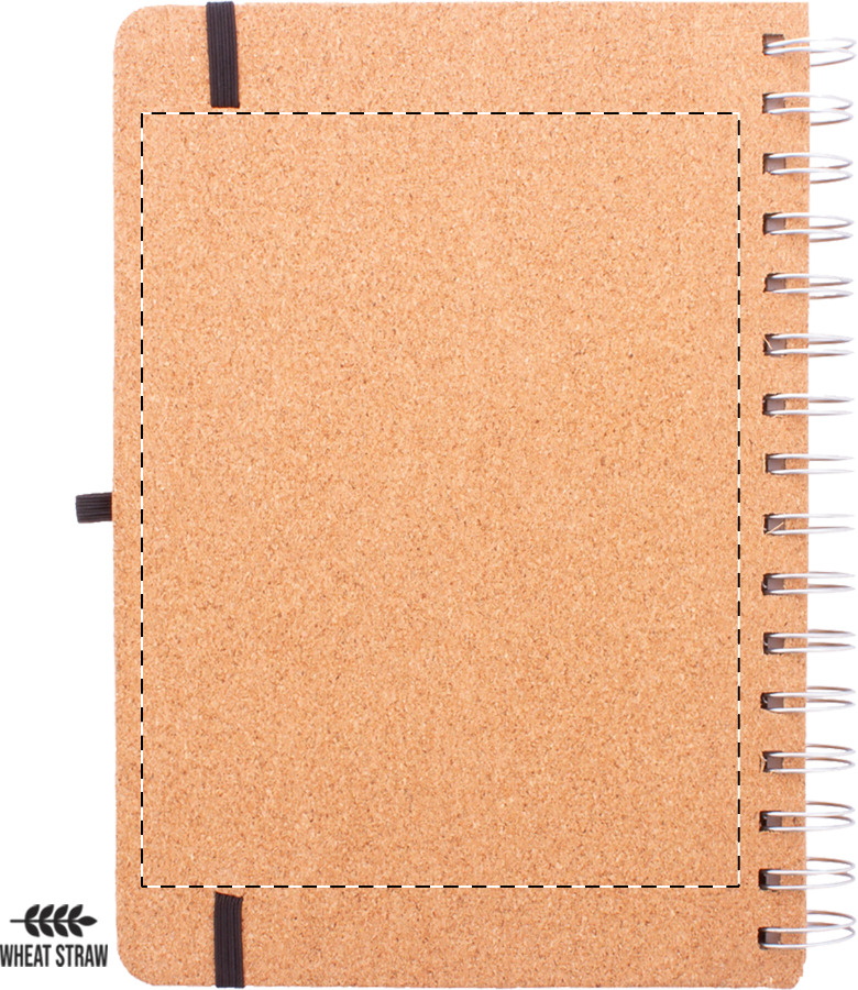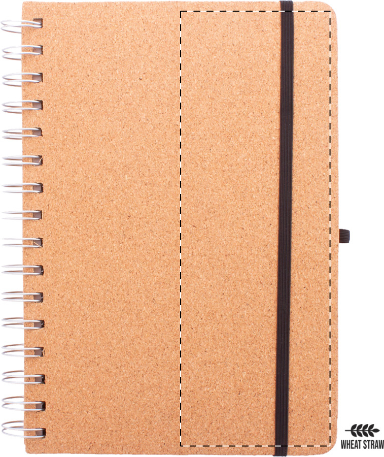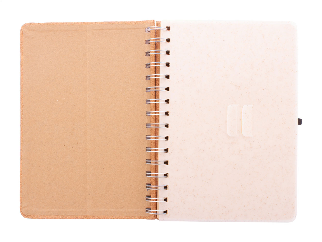 Természetes parafa borítású spirál jegyzetfüzet, búzaszalma műanyag telefon- és tablettartó betéttel. 70 újrahasznosított kraft papírból készült vonalas lappal, gumis pánttal és tolltartóval. A5 méretű.