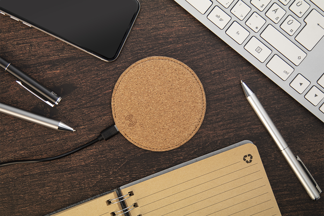 Természetes parafa borítású, vezeték nélküli gyorstöltő (10W) PU bőr talppal. USB töltőkábellel szállítjuk.