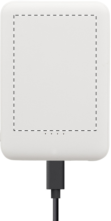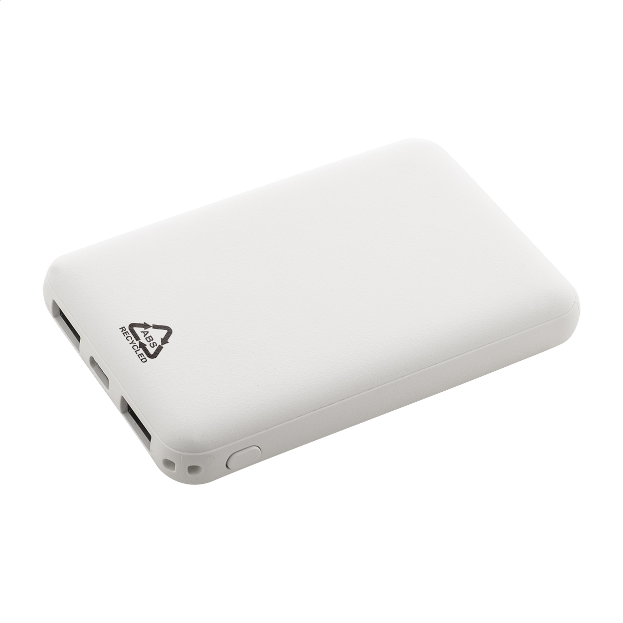 Újrahasznosított ABS műanyag power bank 5000 mAh-s akkumulátorral. 2 USB és 1 USB-C töltőporttal. Micro USB és USB-C bemeneti porttal és USB töltőkábellel.