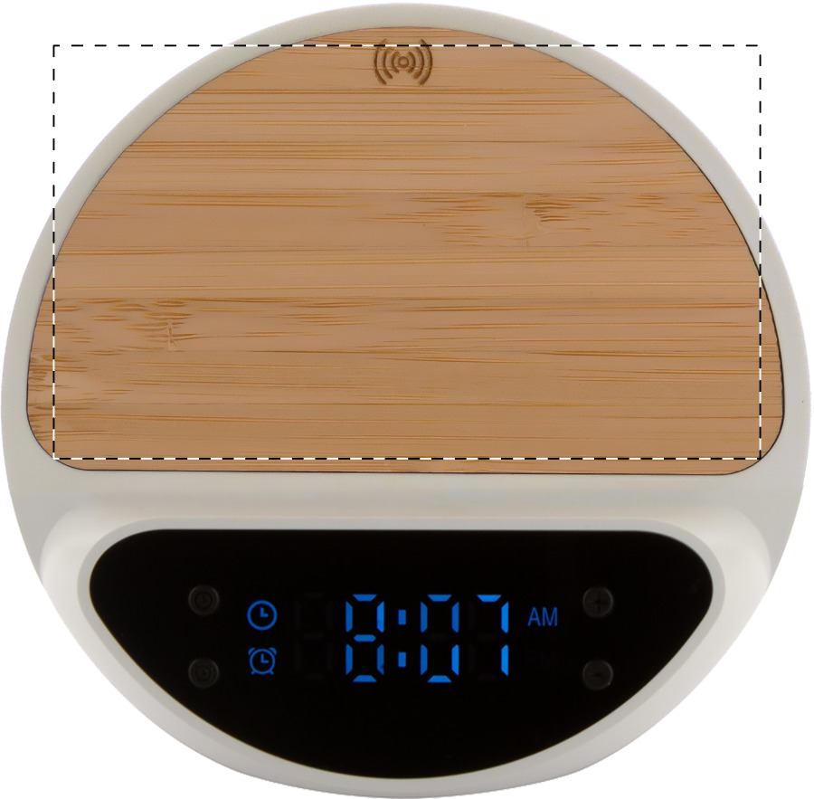 Digitális ébresztőóra újrahasznosított ABS és bambusz borítással, mobiltelefon-tartóval és beépített vezeték nélküli gyorstöltővel (15W). USB töltőkábellel szállítjuk.