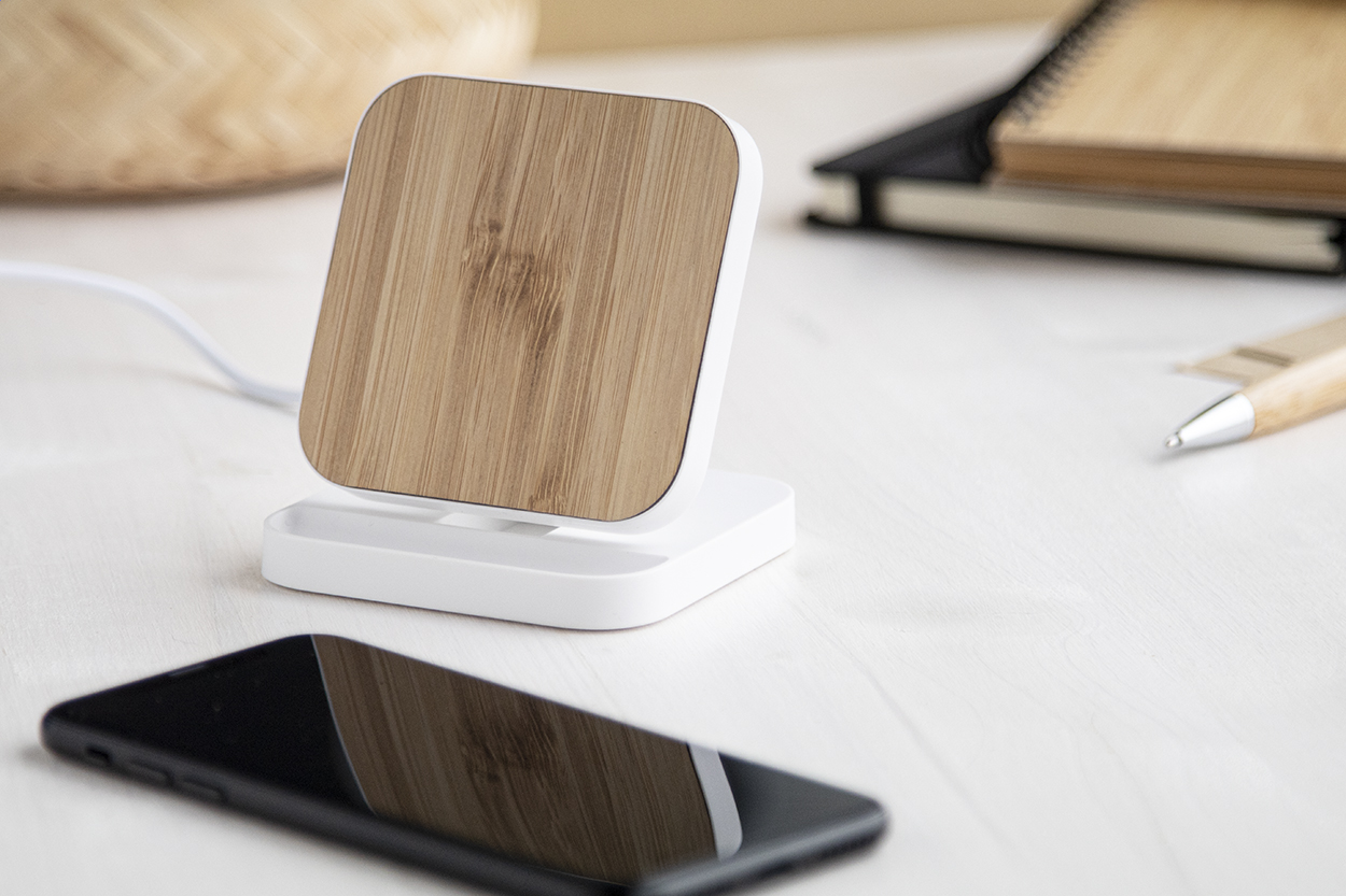 Újrahasznosított ABS műanyag mobiltelefon-tartó, bambusz borítású vezeték nélküli gyorstöltővel (15W). USB töltőkábellel szállítjuk.