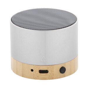 Újrahasznosított alumínium vezeték nélküli hangszóró bambusz alappal. Kihangosító funkcióval és beépített újratölthető akkumulátorral. USB töltőkábellel szállítjuk.