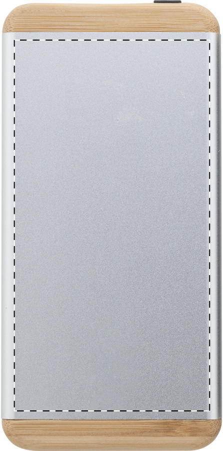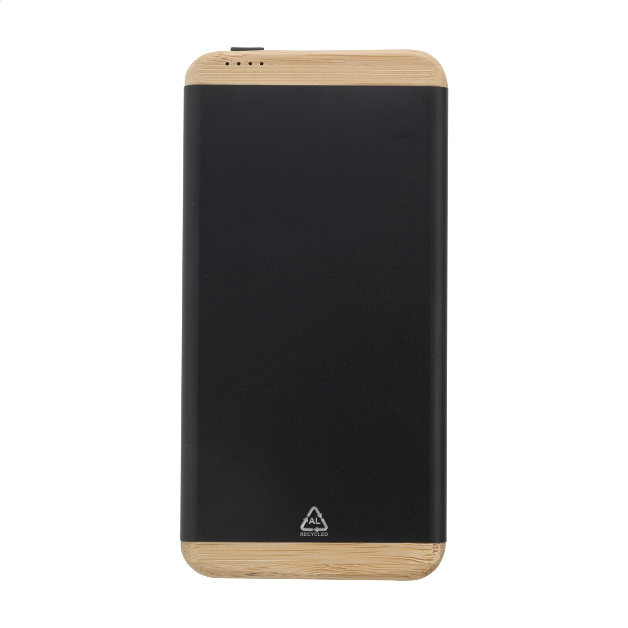 Újrahasznosított alumíniumból és bambuszból készült power bank 5000 mAh akkumulátorral. 1 USB és 1 USB-C töltőporttal. USB-C bemeneti porttal és USB töltőkábellel.