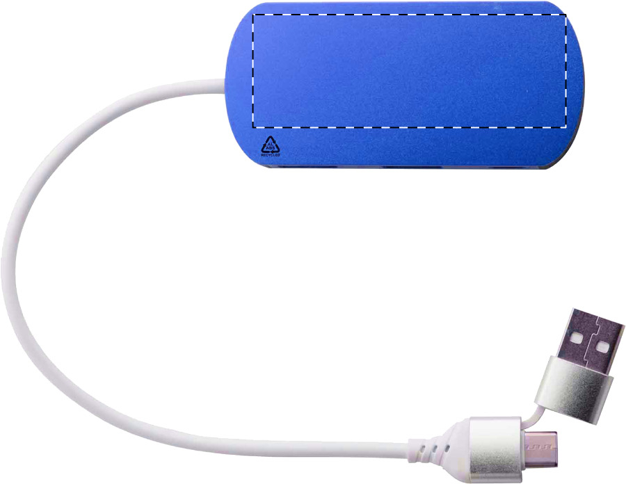 Újrahasznosított alumínium és újrahasznosított ABS műanyag USB hub 2 USB és 1 USB-C porttal, USB 2.0. USB és USB-C csatlakozású kábellel szállítjuk.