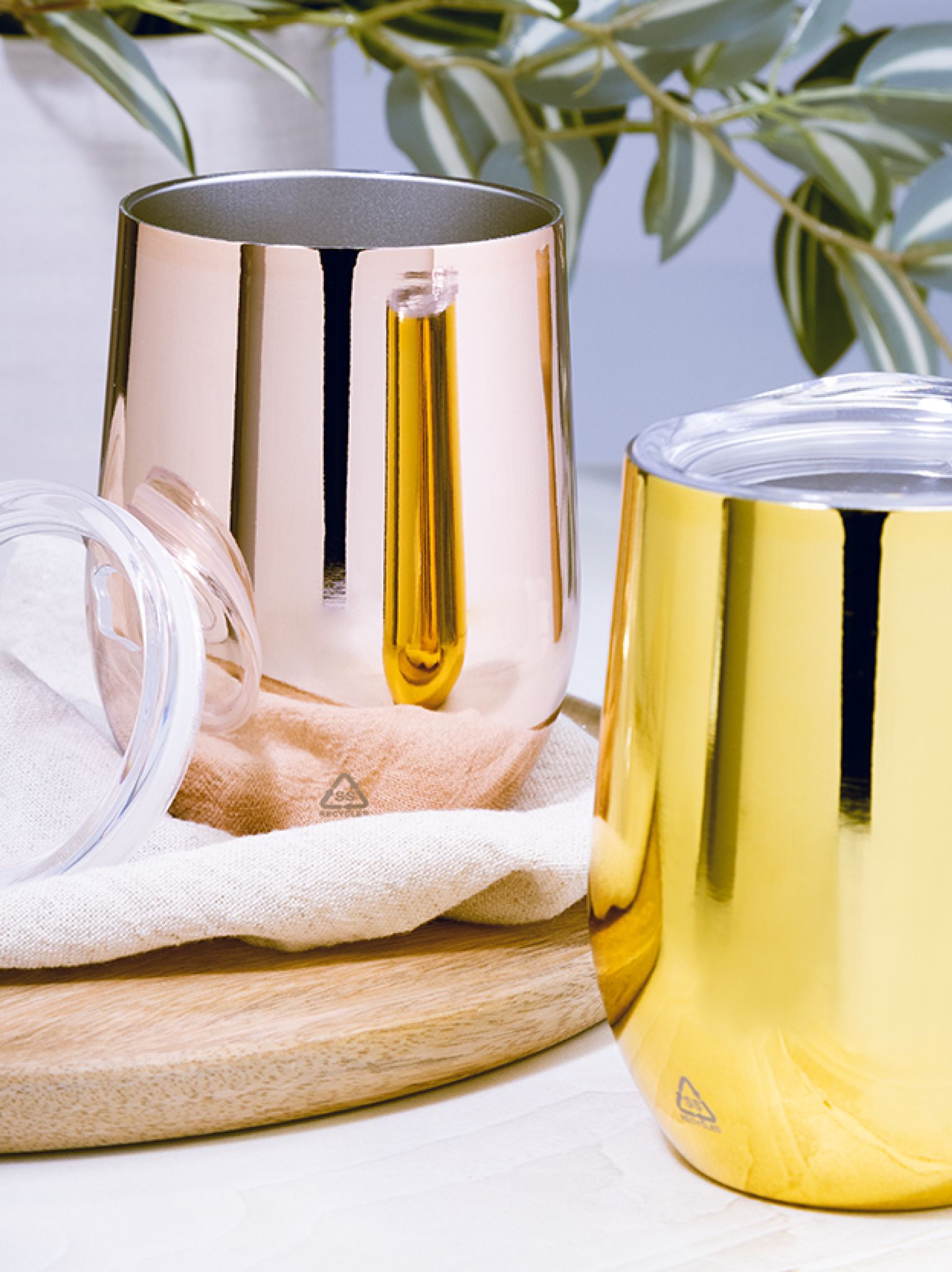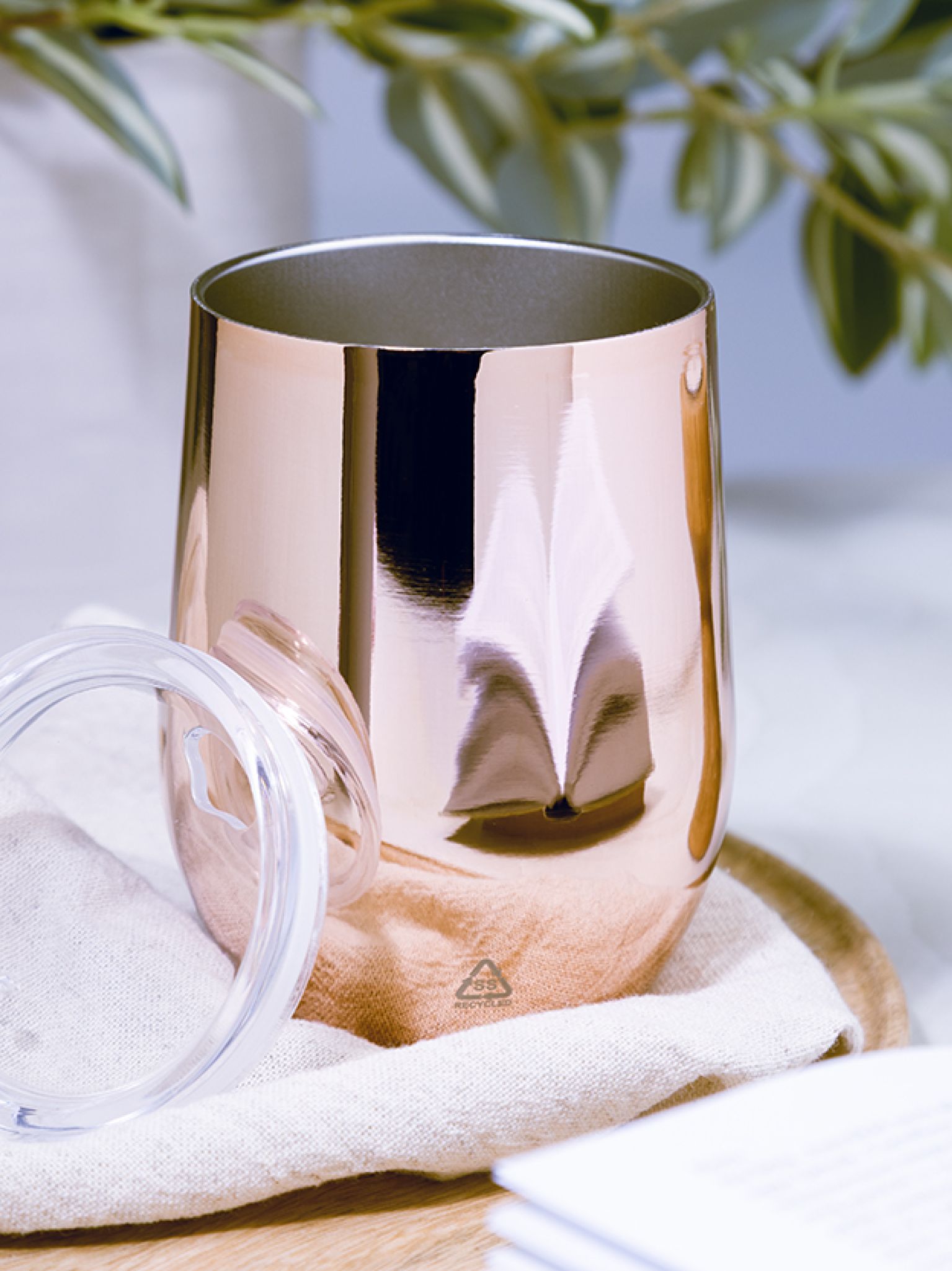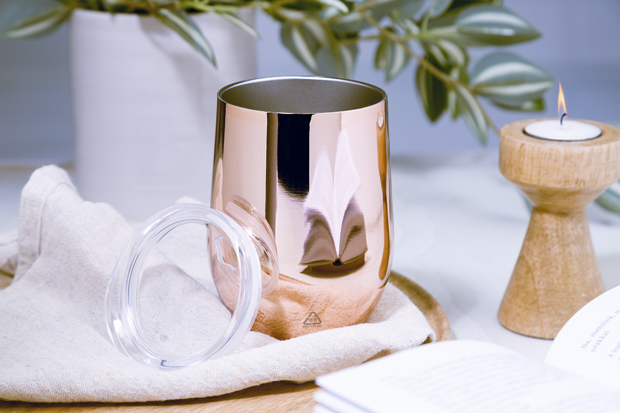 Duplafalú, újrahasznosított rozsdamentes acél thermo pohár magasfényű fémes bevonattal és műanyag ivófedéllel. 350 ml.
