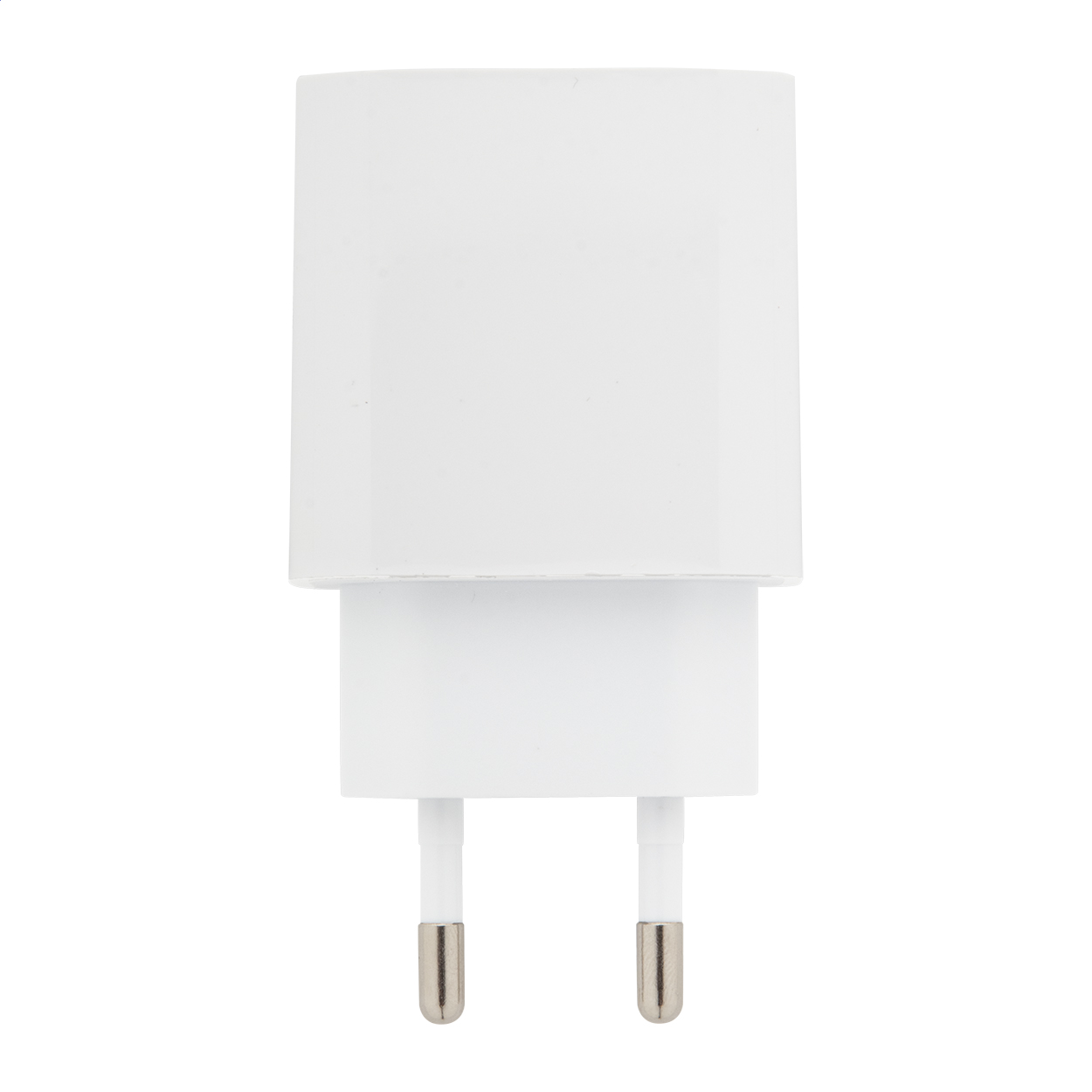 Újrahasznosított ABS műanyag fali gyorstöltő 1 USB és 1 UBS-C porttal. Gyorstöltő technológiával (PD20W / QC3.0) és 2 pólusú európai csatlakozóval.