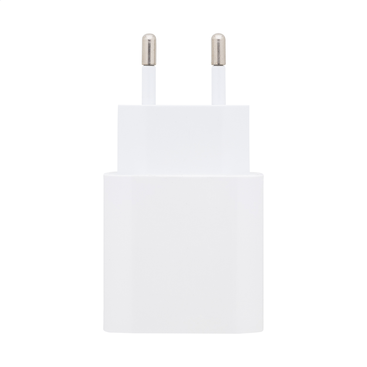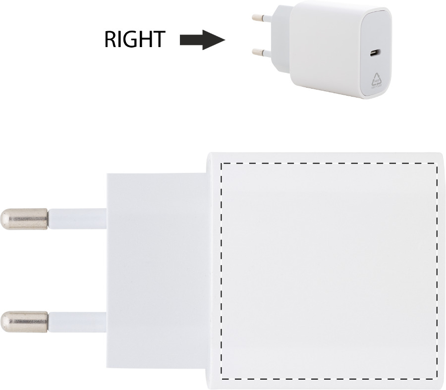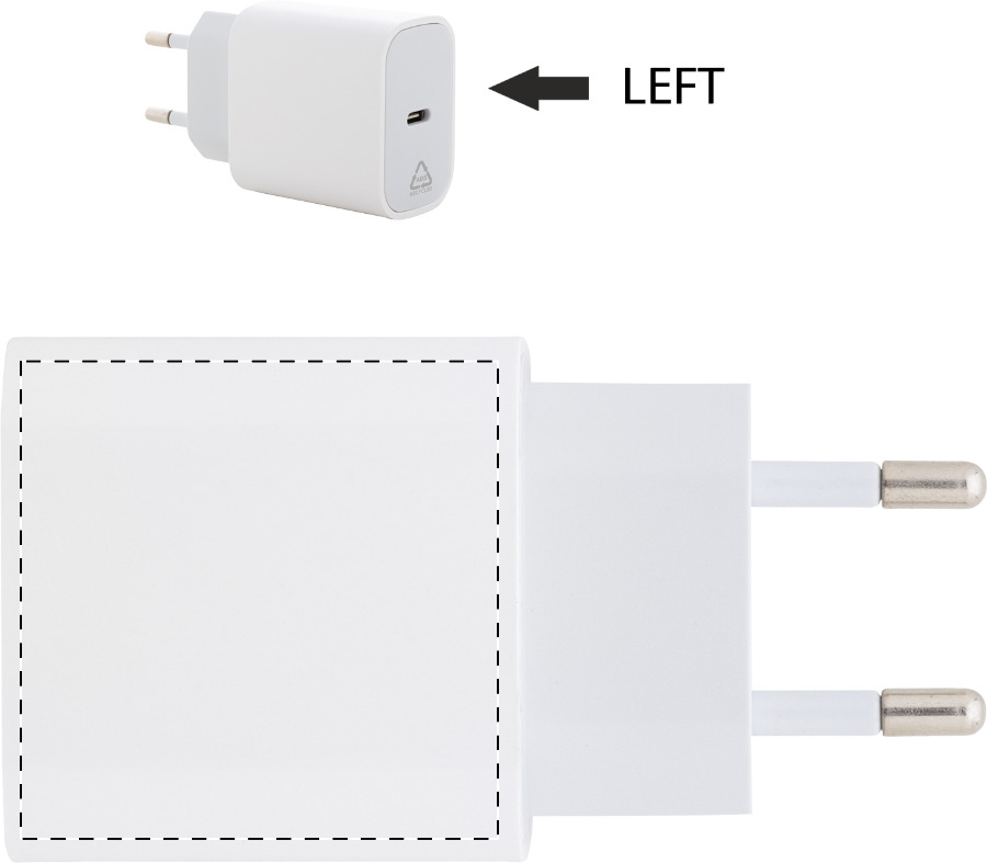 Újrahasznosított ABS gyorstöltő USB fali töltő 1 USB-C porttal. Támogatja a gyorstöltési technológiát (PD20W / QC3.0). 2 pólusú európai csatlakozóval.