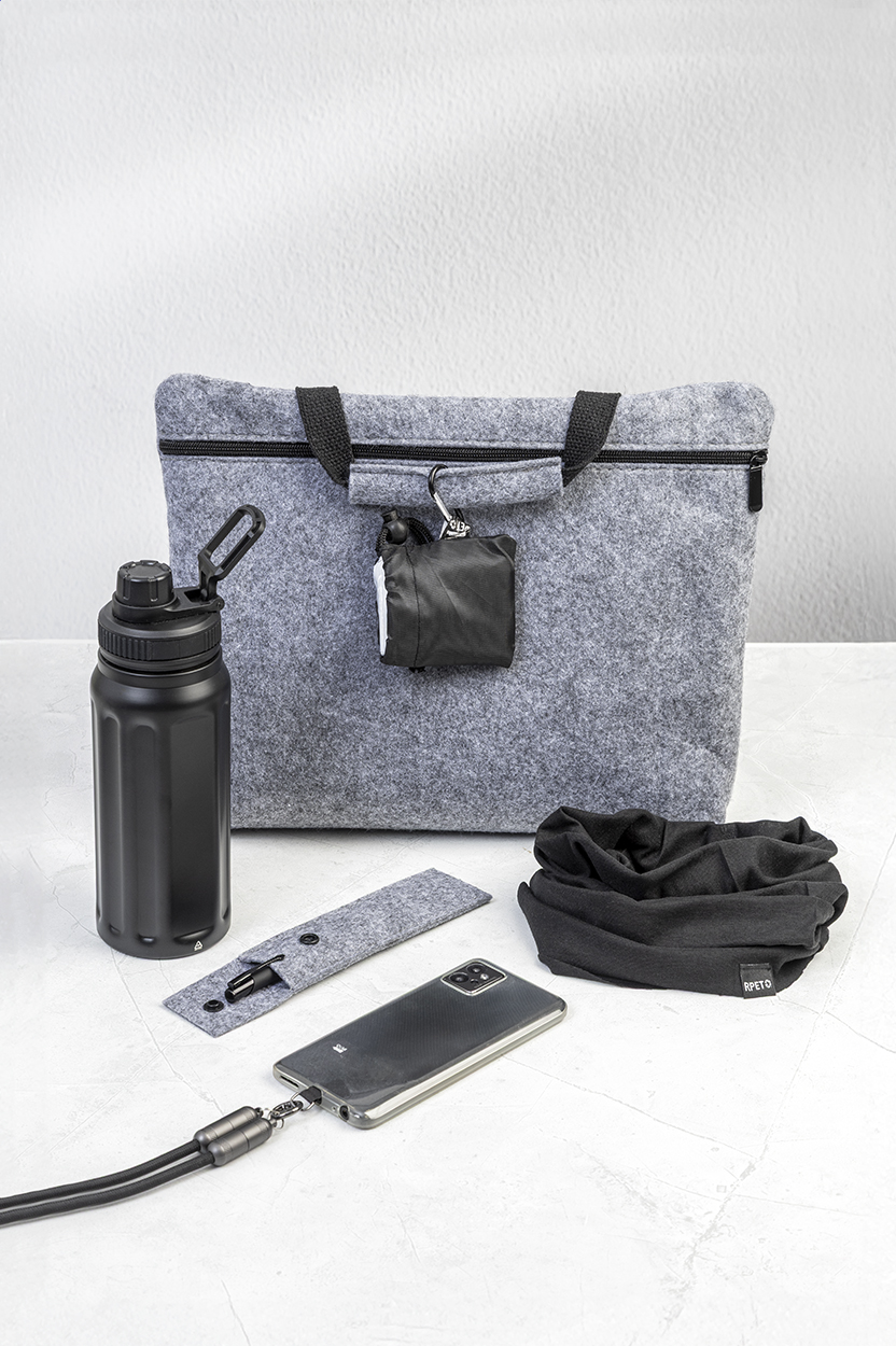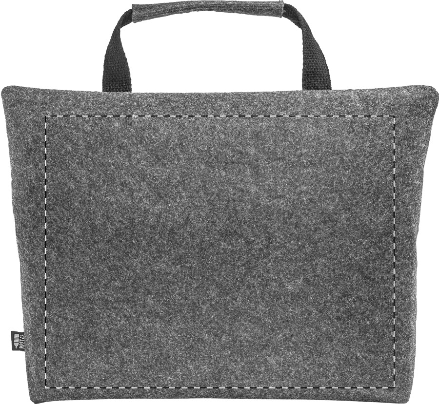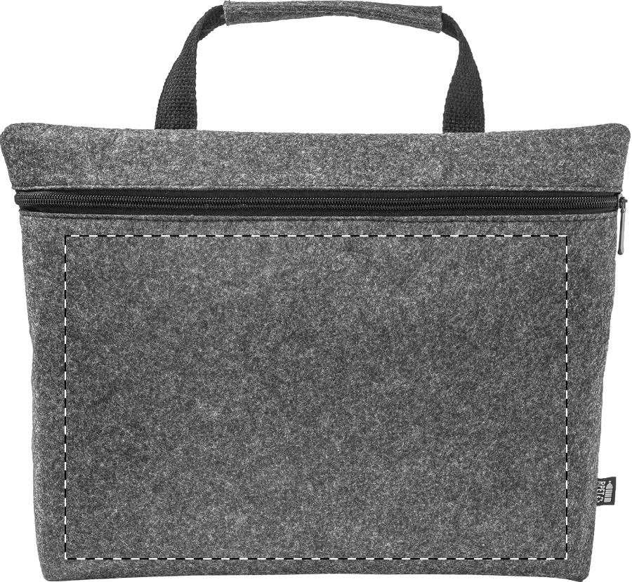 RPET filcből készült irat- és laptoptáska cipzáras fő rekesszel és cipzáras belső zsebbel. Legfeljebb 15"-os laptopokhoz alkalmas. Megkülönböztető RPET címkével.