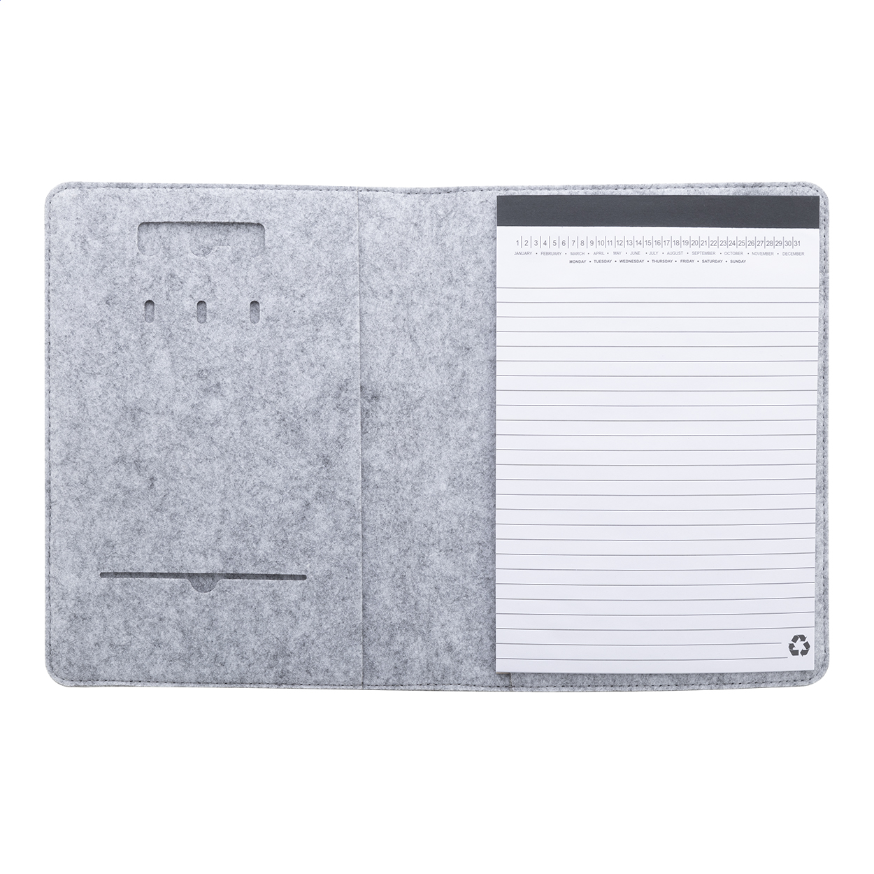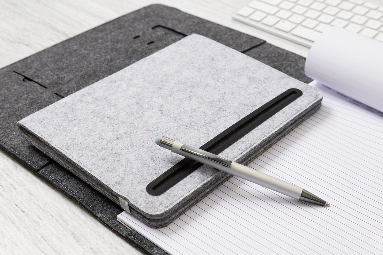 A5-ös méretű, RPET filc iratmappa elülső és több belső rendezőzsebbel. 20 vonalas jegyzettömbbel újrahasznosított papírból.