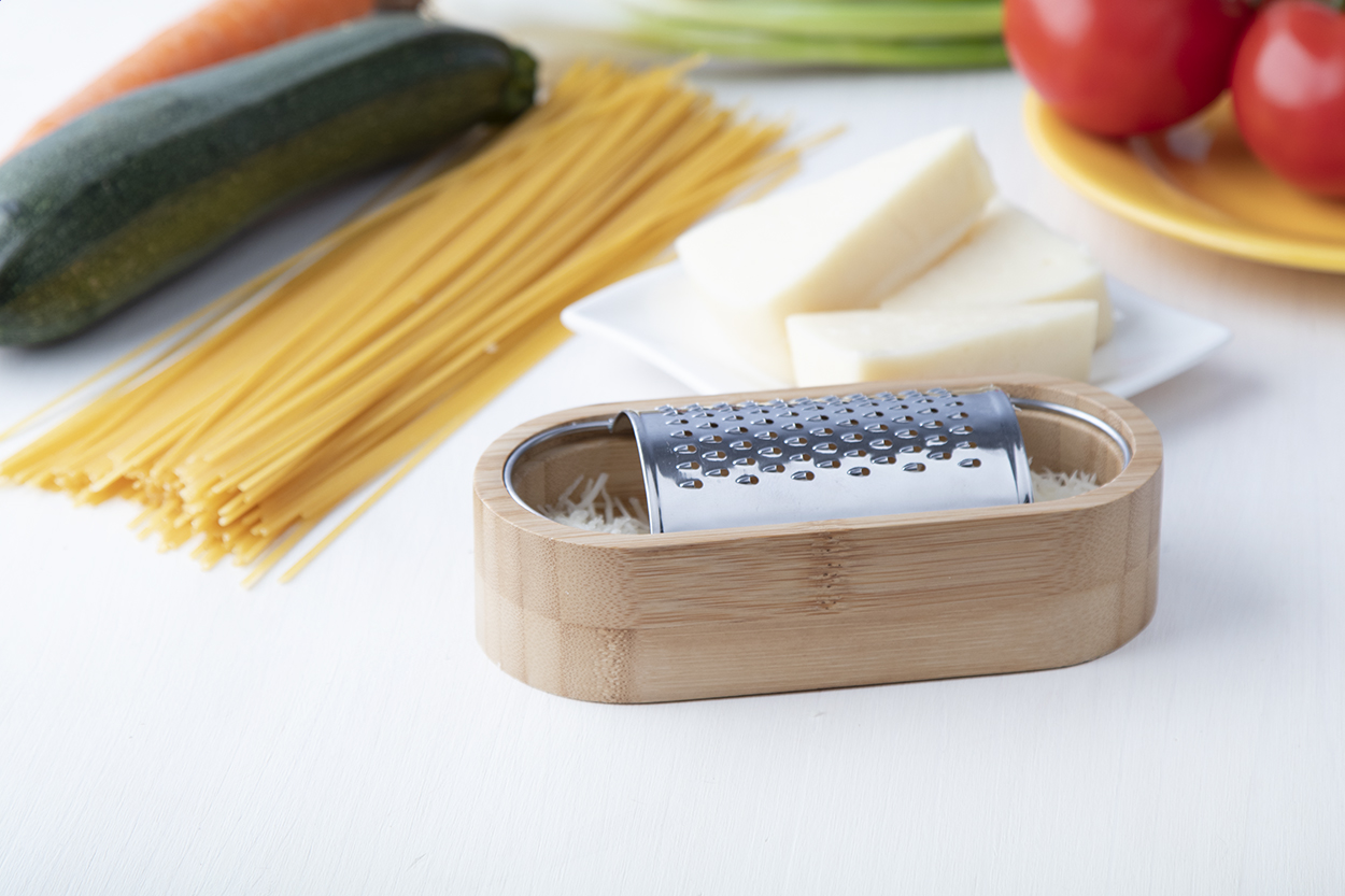 Rozsdamentes acél sajtreszelő bambusz tálkával.