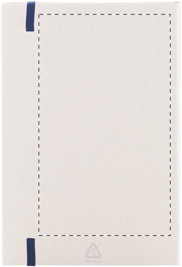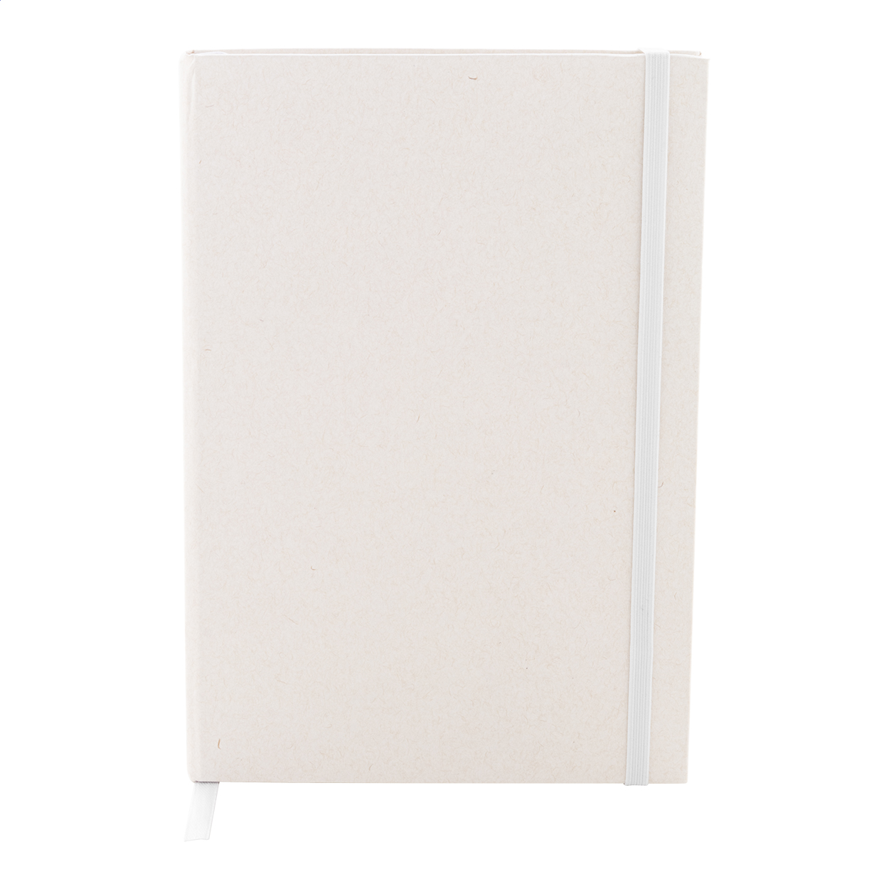 Újrahasznosított tejesdoboz anyagú jegyzetfüzet kemény borítóval és 80 vonalas lappal. Hozzáillő színű gumiszalaggal. A5 méretű.