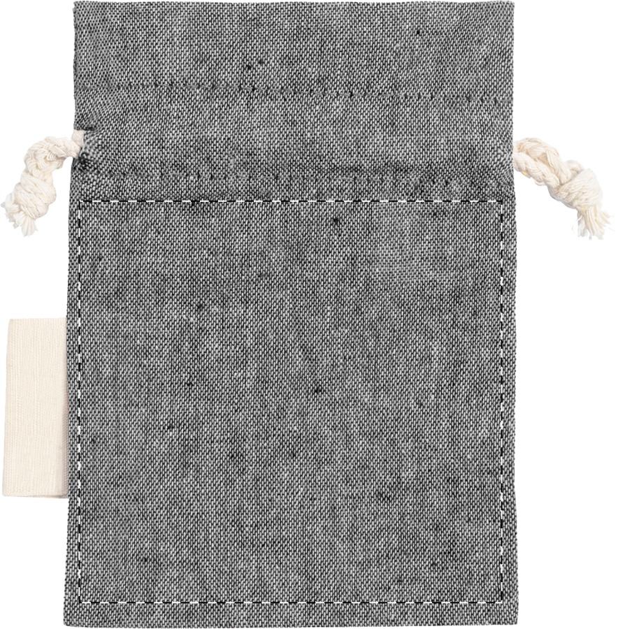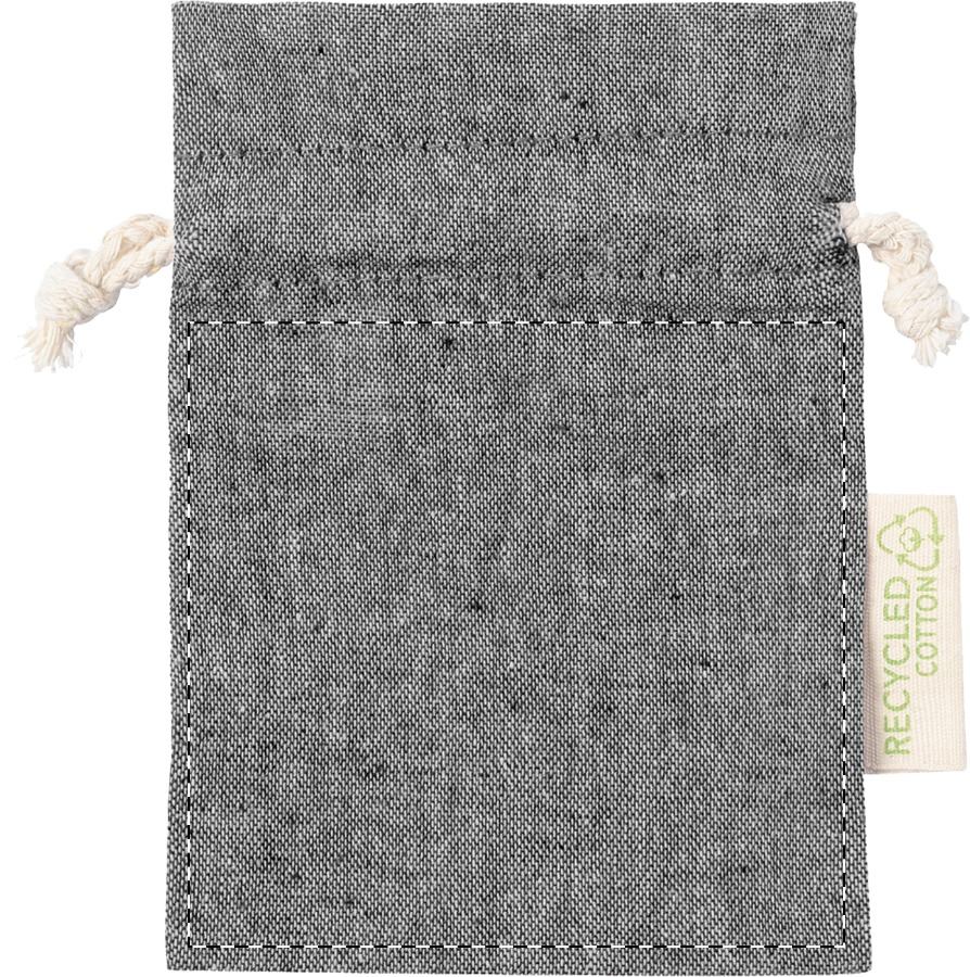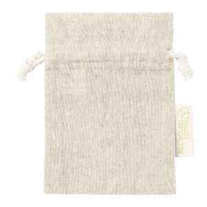 Újrahasznosított pamut ajándéktáska húzózsinórral. Megkülönböztető újrahasznosított pamut címkével. 100% újrahasznosított pamut, 120 g/m².