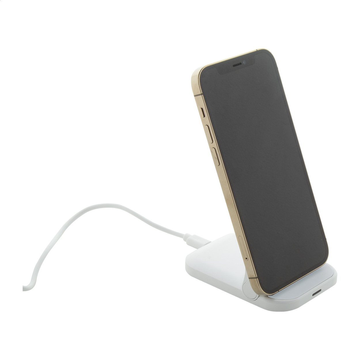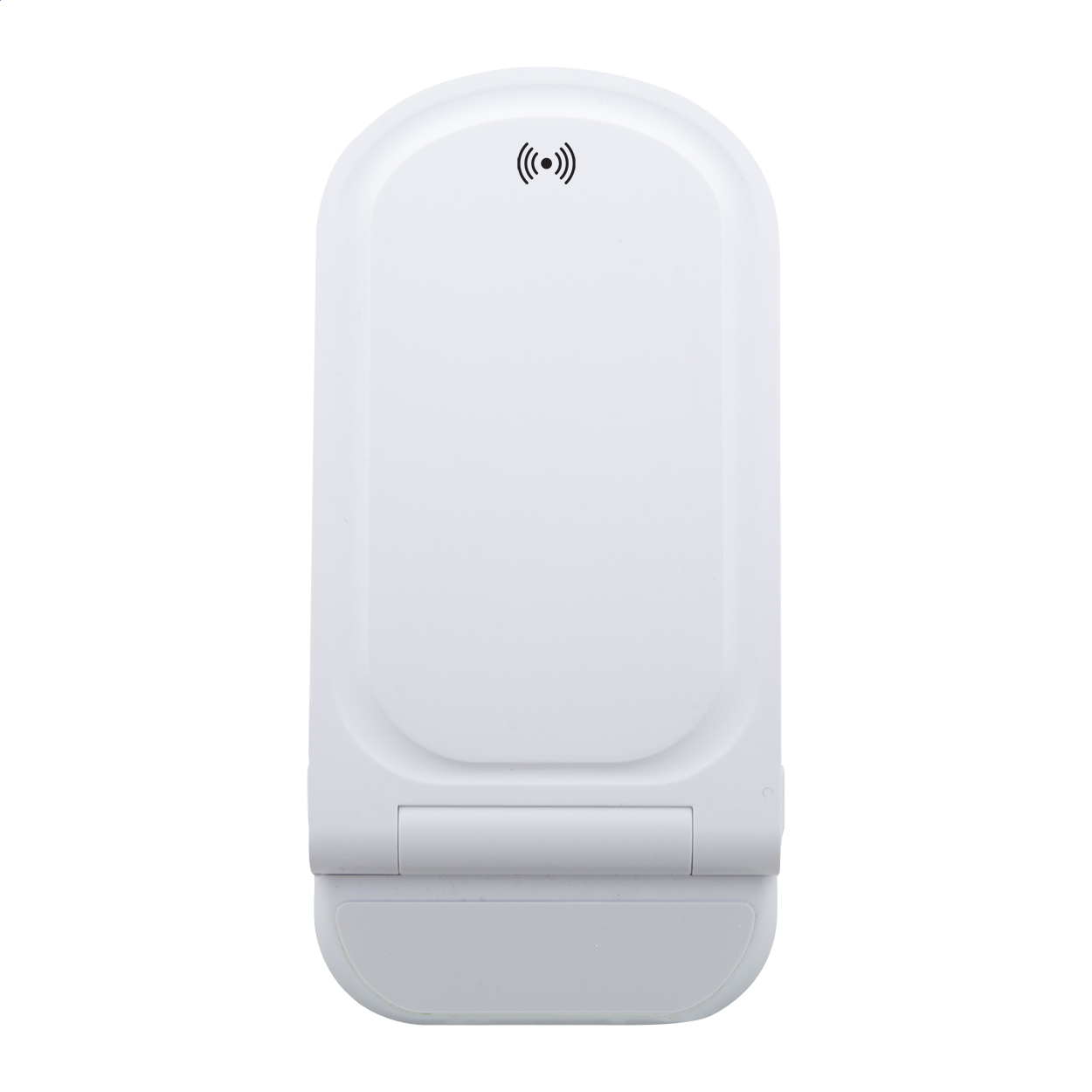 Összecsukható, állítható asztali mobiltartó újrahasznosított ABS műanyagból, beépített vezeték nélküli gyorstöltővel (15W). USB töltőkábellel szállítjuk.