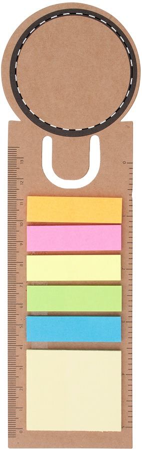 Papír könyvjelző öntapadós jegyzetlapokkal, oldalán vonalzóval.