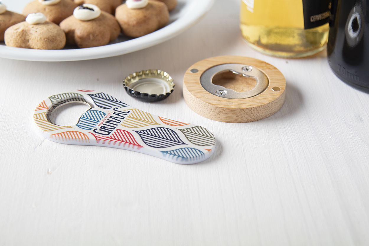Kör alakú bambusz hűtőmágnes, sörnyitóval.