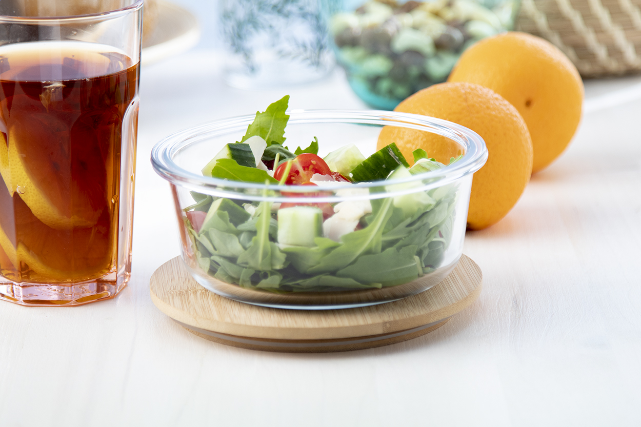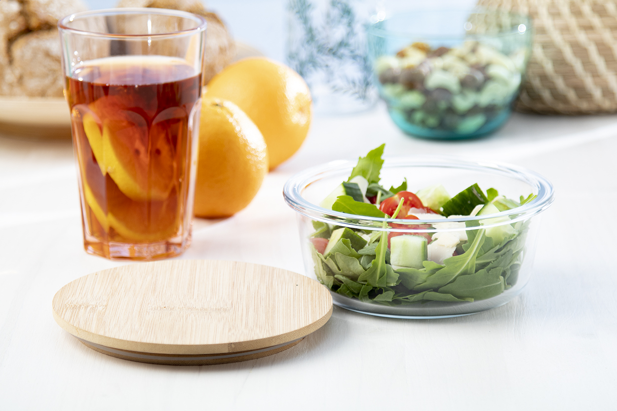 Kerek, üveg uzsonnás doboz természetes bambusz fedéllel, 650 ml.