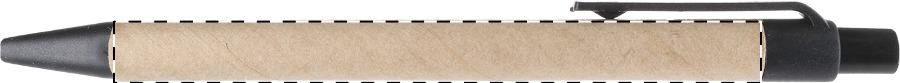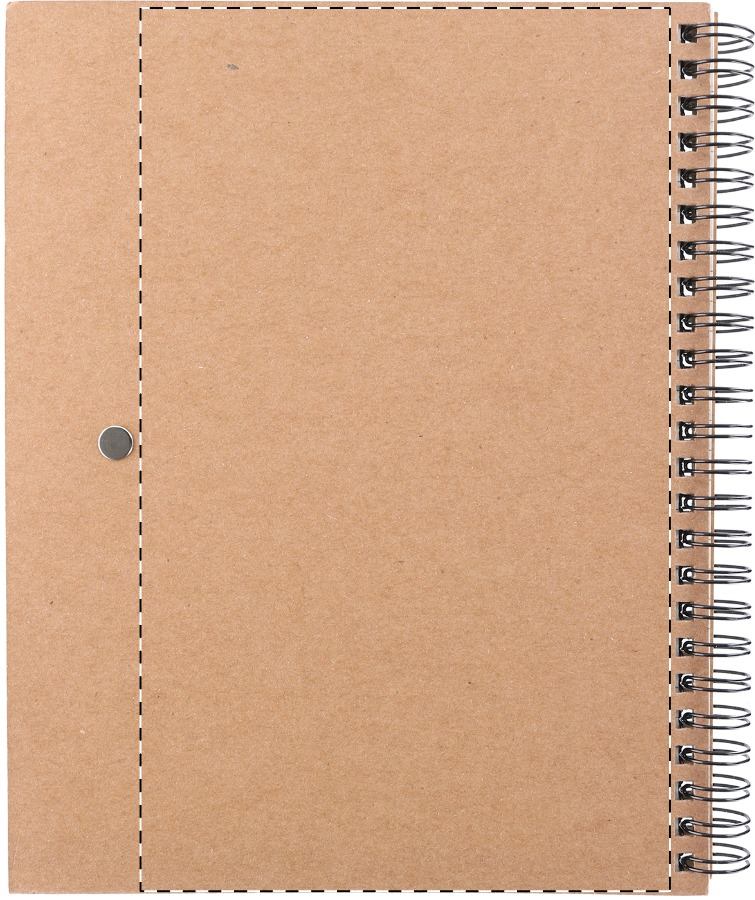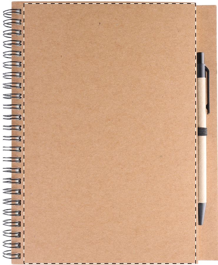 Újrahasznosított karton borítású spirálfüzet 80 db vonalas A5 méretű lapokkal. Tartalmaz egy újrahasznosított papírból készült golyóstollat kék tollbetéttel.