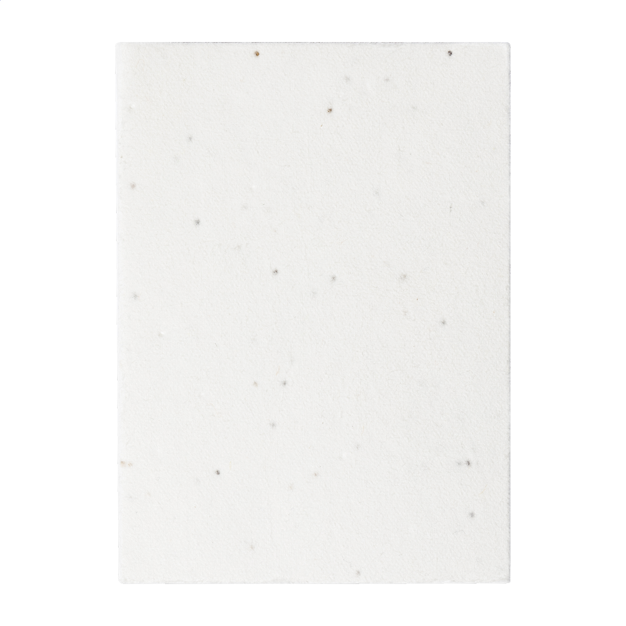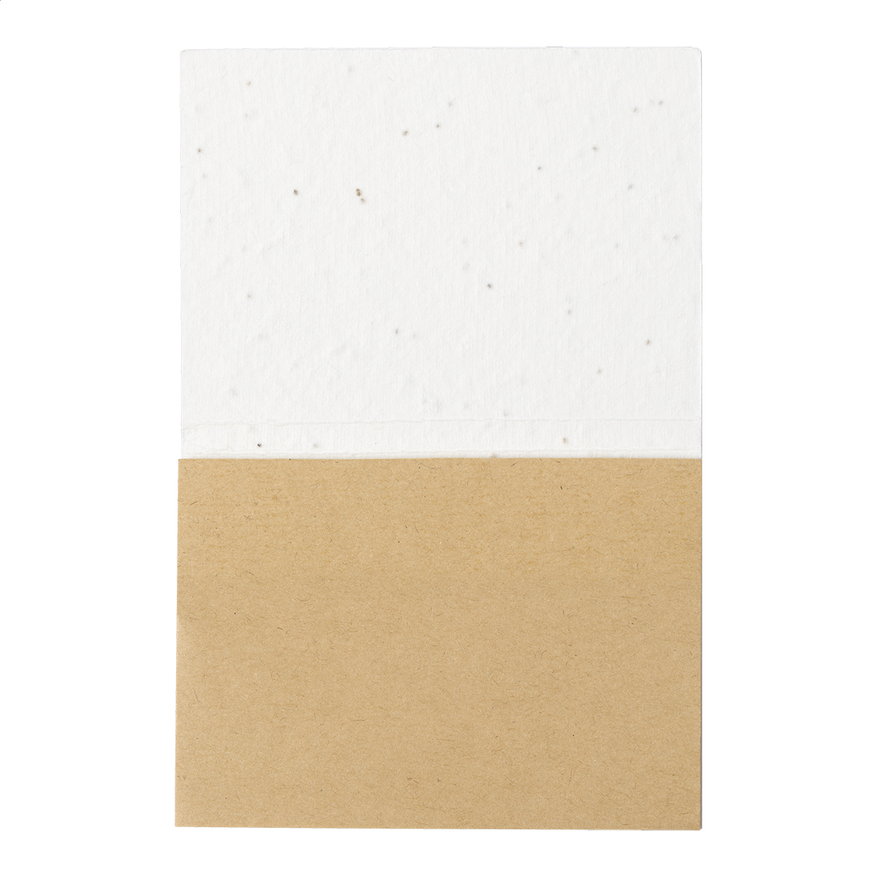 Öntapadós jegyzettömb magpapír borítóval, újrahasznosított kraft papírból készült 50 jegyzetlappal. A magpapír borító változatos színű petúniamagokat tartalmaz, melyeket a borító és a füzet szétválasztása után lehet elültetni.