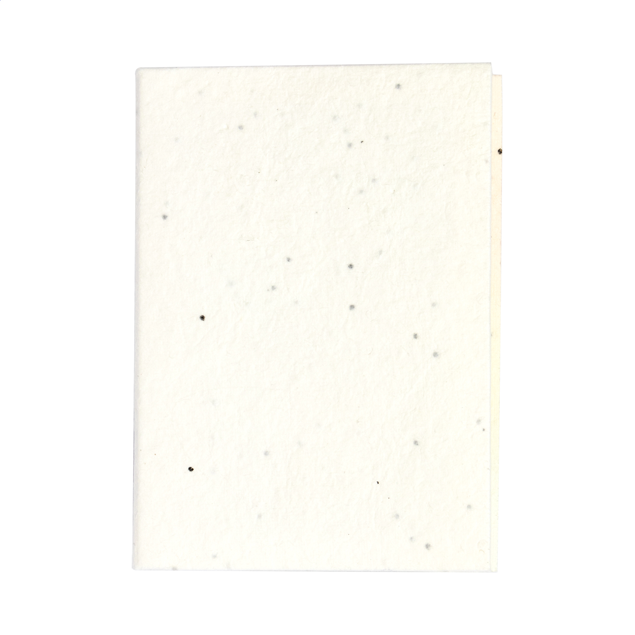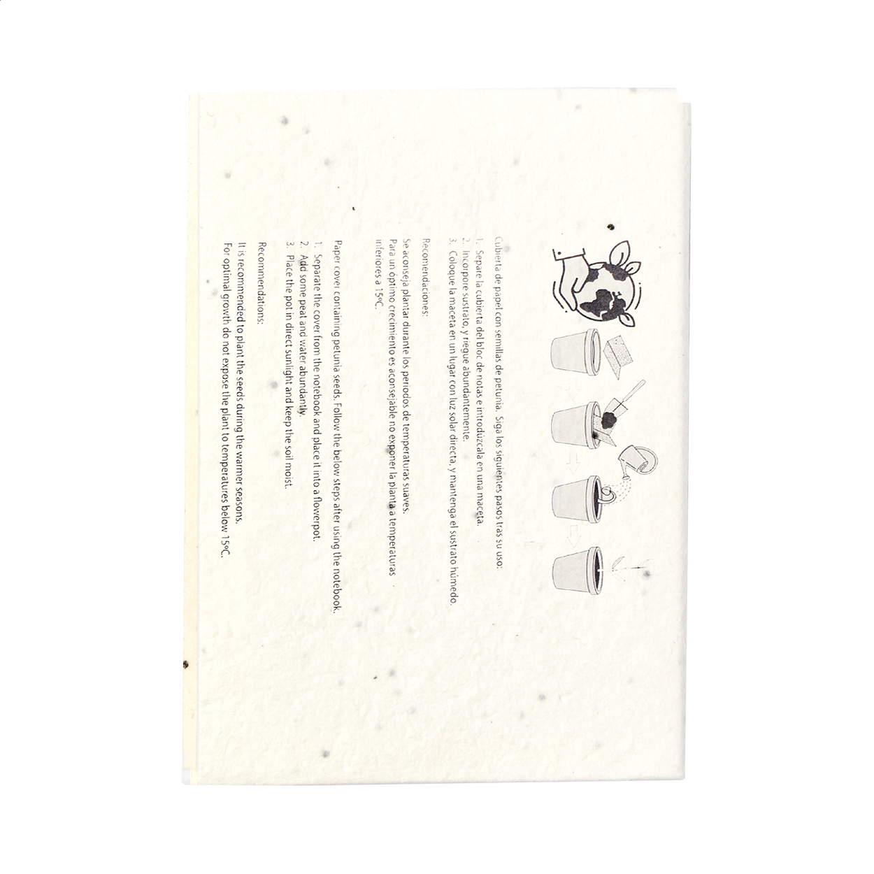Öntapadós jegyzettömb magpapír borítóval, 25 jegyzetlappal és 125 oldaljelölővel (5 féle színben). A magpapír borító változatos színű petúniamagokat tartalmaz, melyeket a borító és a füzet szétválasztása után lehet elültetni.