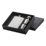 Rozsdamentes acél laposüveg szett tölcsérrel és 2 feles pohárral, 230 ml. Fekete díszdobozban szállítjuk.