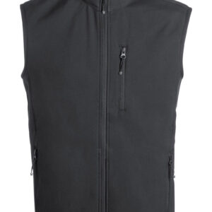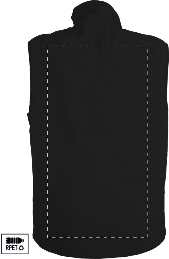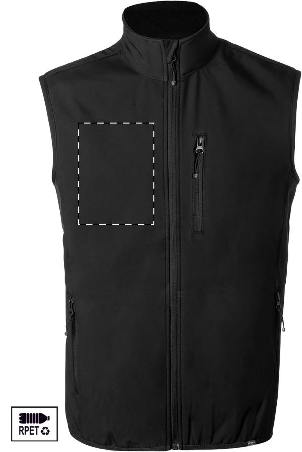 Légáteresztő, víz- és szélálló cipzáras RPET softshell testmelegítő mellény mellkasi és oldalzsebekkel. Kívül: 92% RPET poliészter és 8% elasztán. Belül: 100% mikroszálas RPET poliészter. 300 g/m².