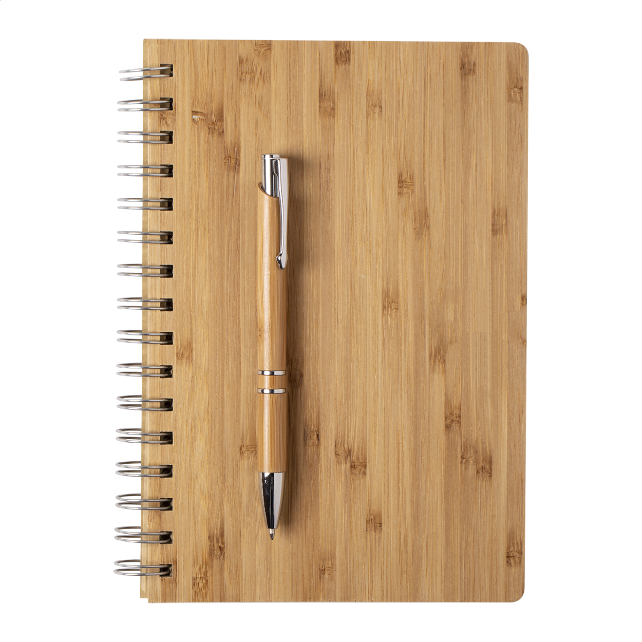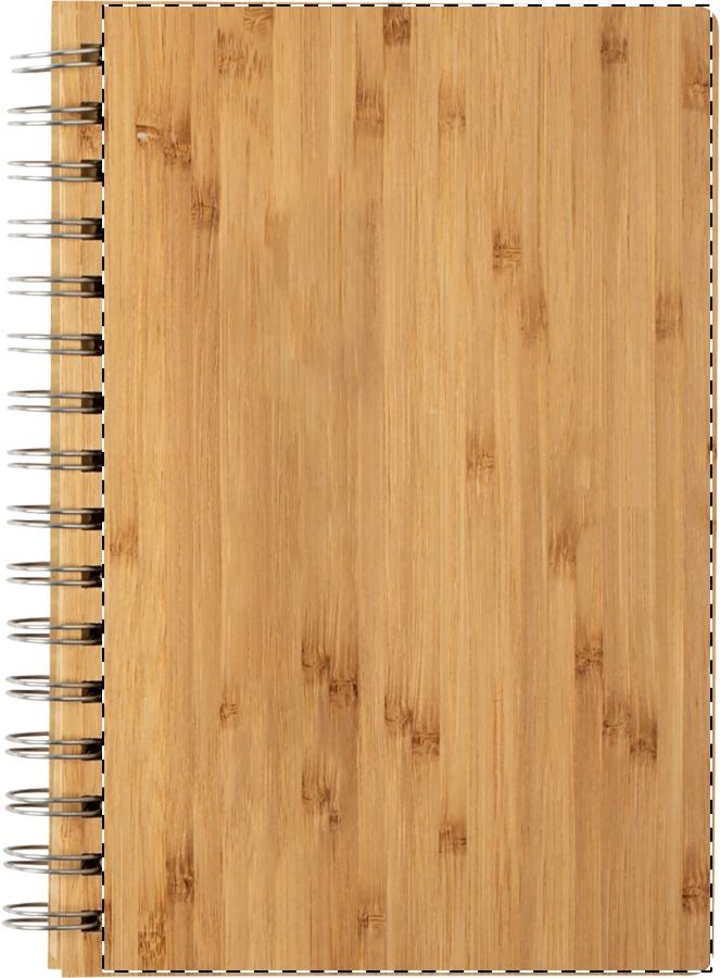 Bambusz borítós spirál jegyzetfüzet 80 vonalas lappal, A5 méretben. Bambusz golyóstollal, fekete tollbetéttel. Kraft papír dobozban szállítjuk.