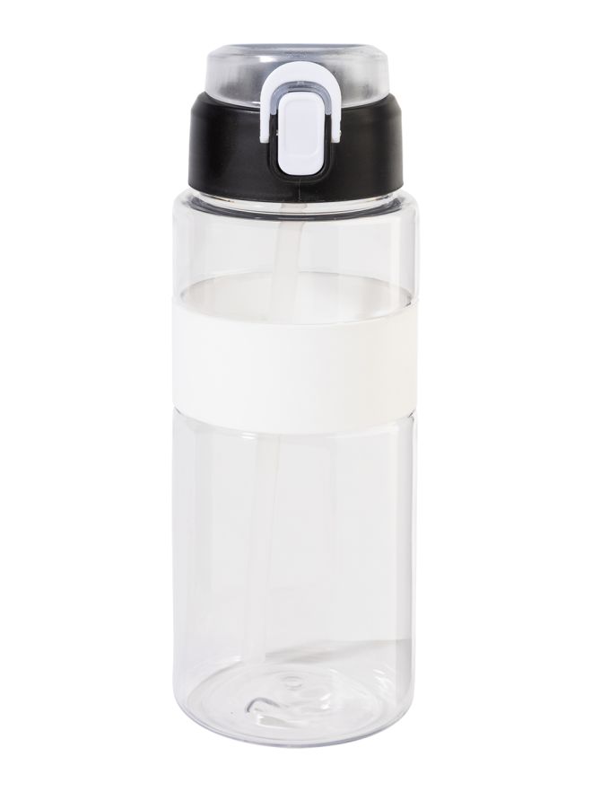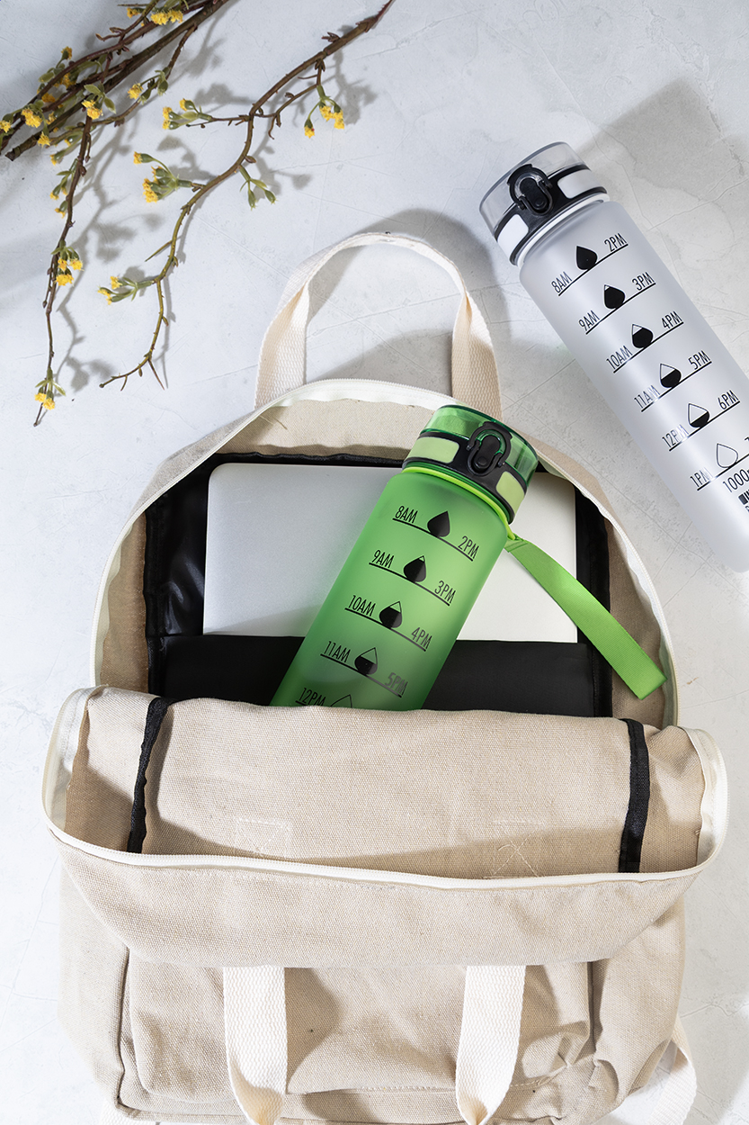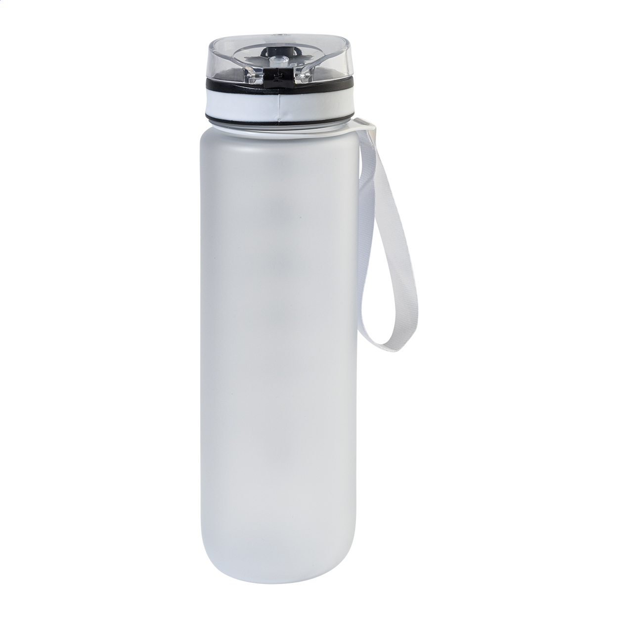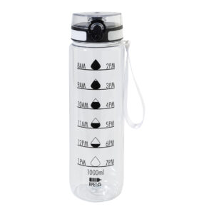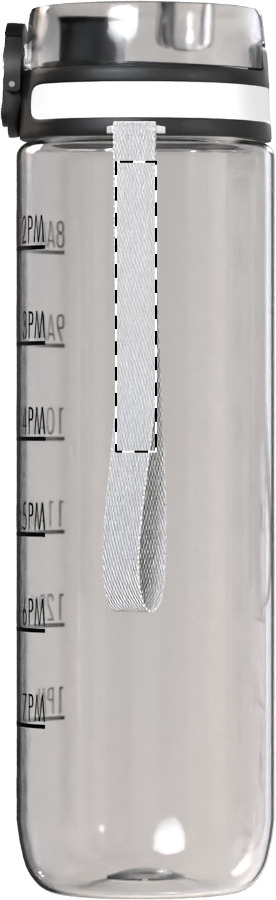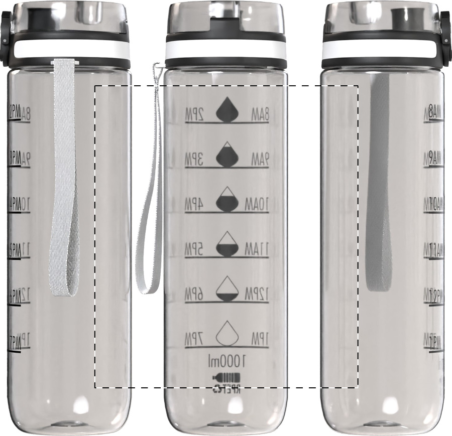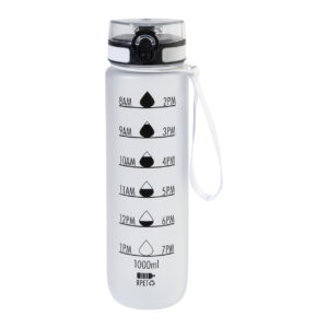 Matt felületű RPET sportkulacs motivációs mennyiség- és időjelzésekkel, automatikusan nyíló, pattintható tetővel, biztonsági zárral és hordpánttal. 1000 ml.