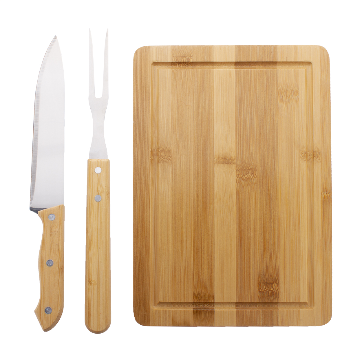 Bambusz húsvágó szett bambusz vágódeszkával, rozsdamentes acél villával és bambusz markolatú késsel.