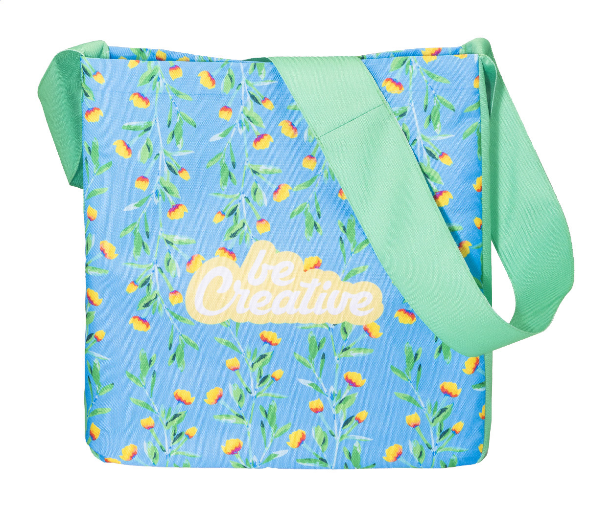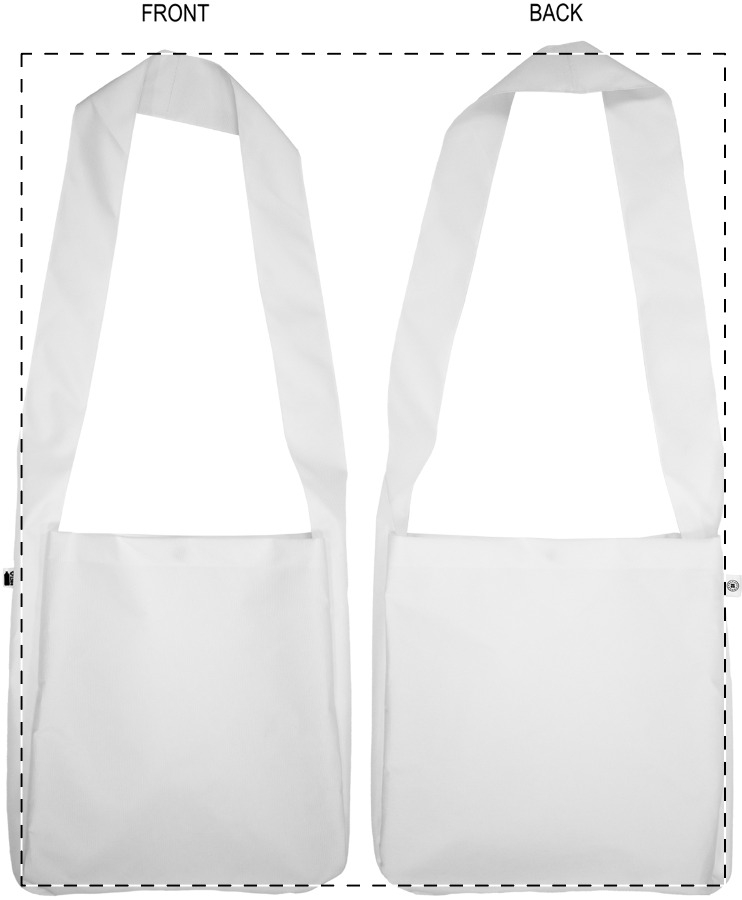 Egyedi gyártású, 600D RPET poliészter válltáska hosszú vállpánttal és gombbal. Teljes felületén szublimációs nyomtatott grafikával és megkülönböztető RPET címkével. Minimális rendelési mennyiség: 25 db.