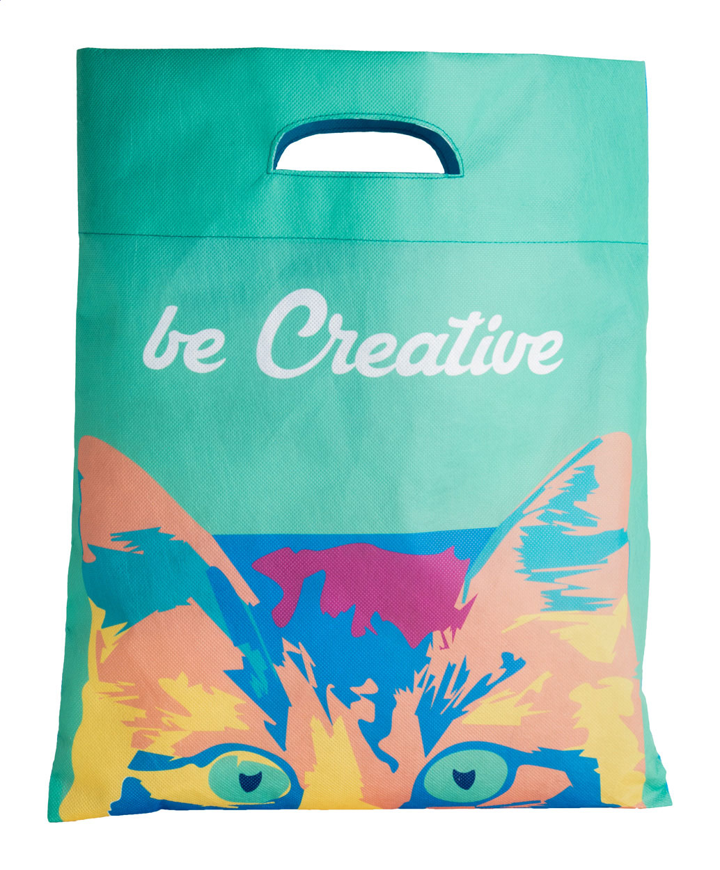 Egyedi grafikával ellátott non-woven bevásárlótáska kivágott hordfüllel, 80 g/m². Teljes felületén szublimációs eljárással emblémázva. Minimális rendelési mennyiség: 50 db.