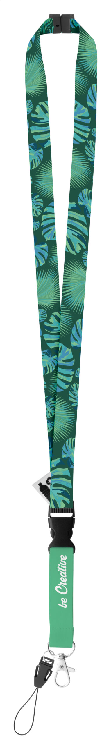 Egyedi grafikával ellátott RPET poliészter nyakpánt levehető fém karabinerrel, mobiltartóval és biztonsági csattal. Mindkét oldalán szublimációs technológiával emblémázva. Minimum rendelési mennyiség: 100 db.