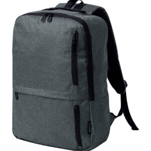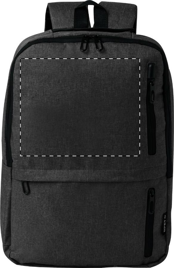 RPET hátizsák cipzáras rekeszekkel, párnázott laptop (15") és tablet (10") rekesszel, párnázott hát- és vállpántokkal. 600D RPET poliészter, megkülönböztető RPET címkével.