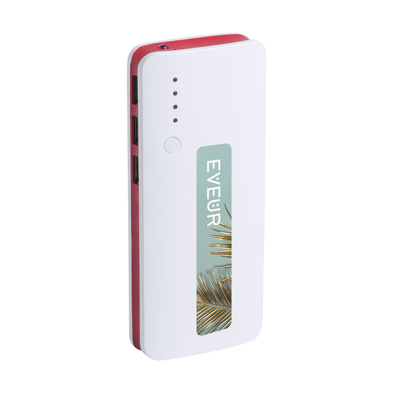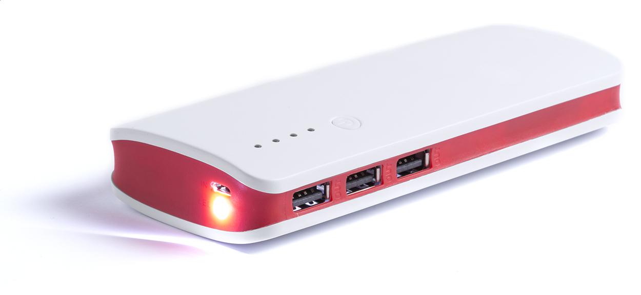 Műanyag USB power bank 3 csatlakozóval és 10000 mAh akkumulátorral. Töltőkábel nélkül szállítjuk.