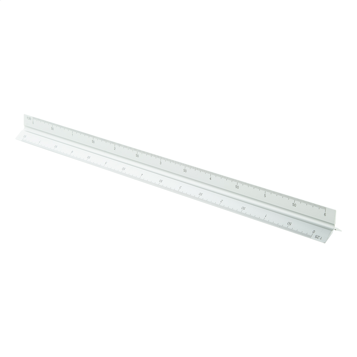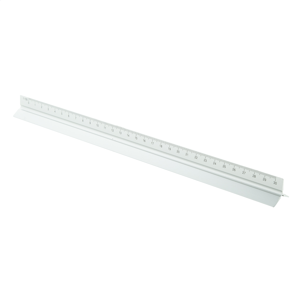Háromszögletű, alumínium méretarány vonalzó. 30 cm-es vonalzóval és 1:20/1:25/1:50/1:75/1:100 méretarányú skálákkal.