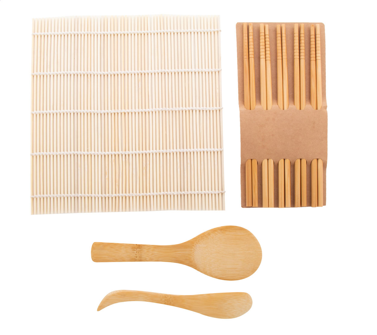 Bambusz sushi készítő készlet sushi gyékénnyel, rizskanállal, rizskéssel és 5 pár evőpálcikával. Kraft papír dobozban szállítjuk.