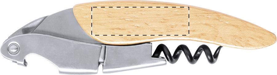 Rozsdamentes acél üvegnyitó és dugóhúzó fa fogantyúval.