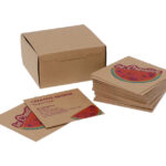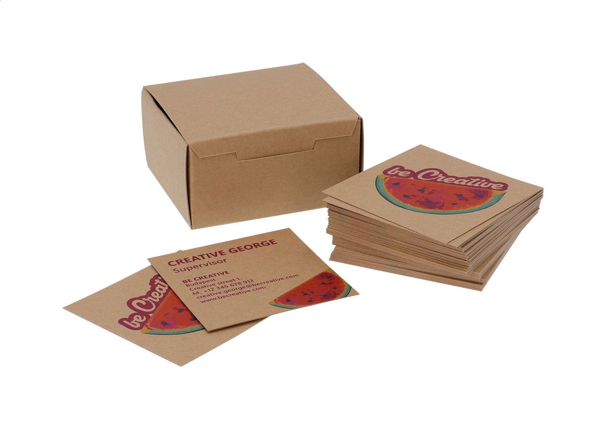 100 db egyedi gyártású, négyzet alakú névjegykártya, mindkét oldalon full-colour nyomtatott grafikával. Matt kraft papír, 300 g/m². Kraft papír dobozban.