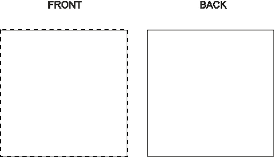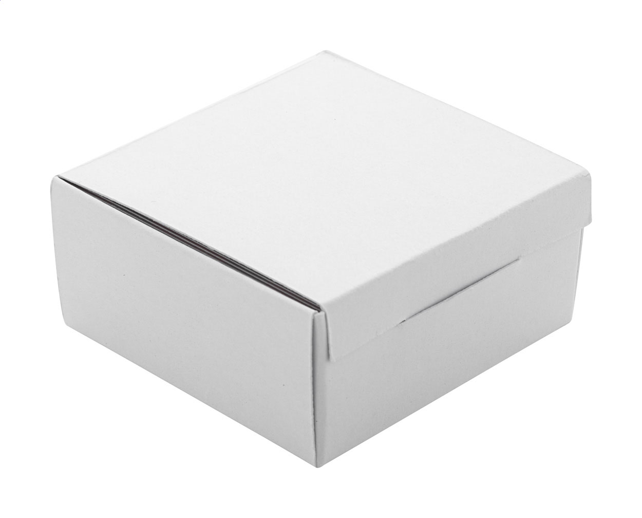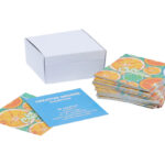 100 db egyedi gyártású, négyzet alakú névjegykártya, mindkét oldalán színes nyomott grafikával. Matt fehér papír, 350 g/m². Fehér papírdobozban.