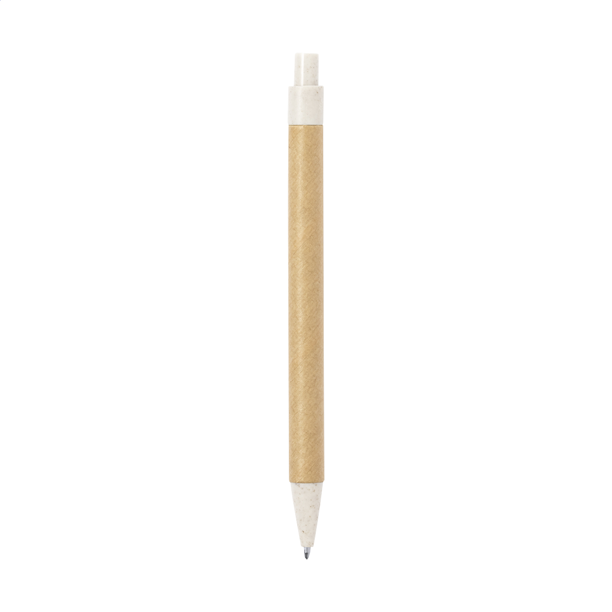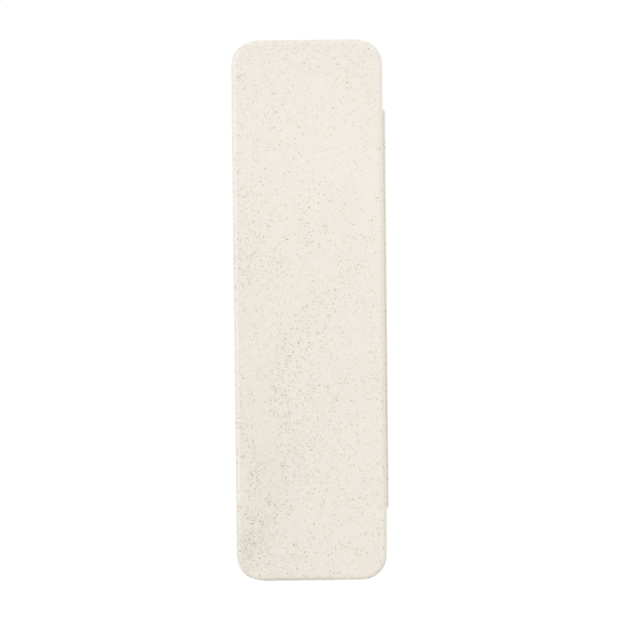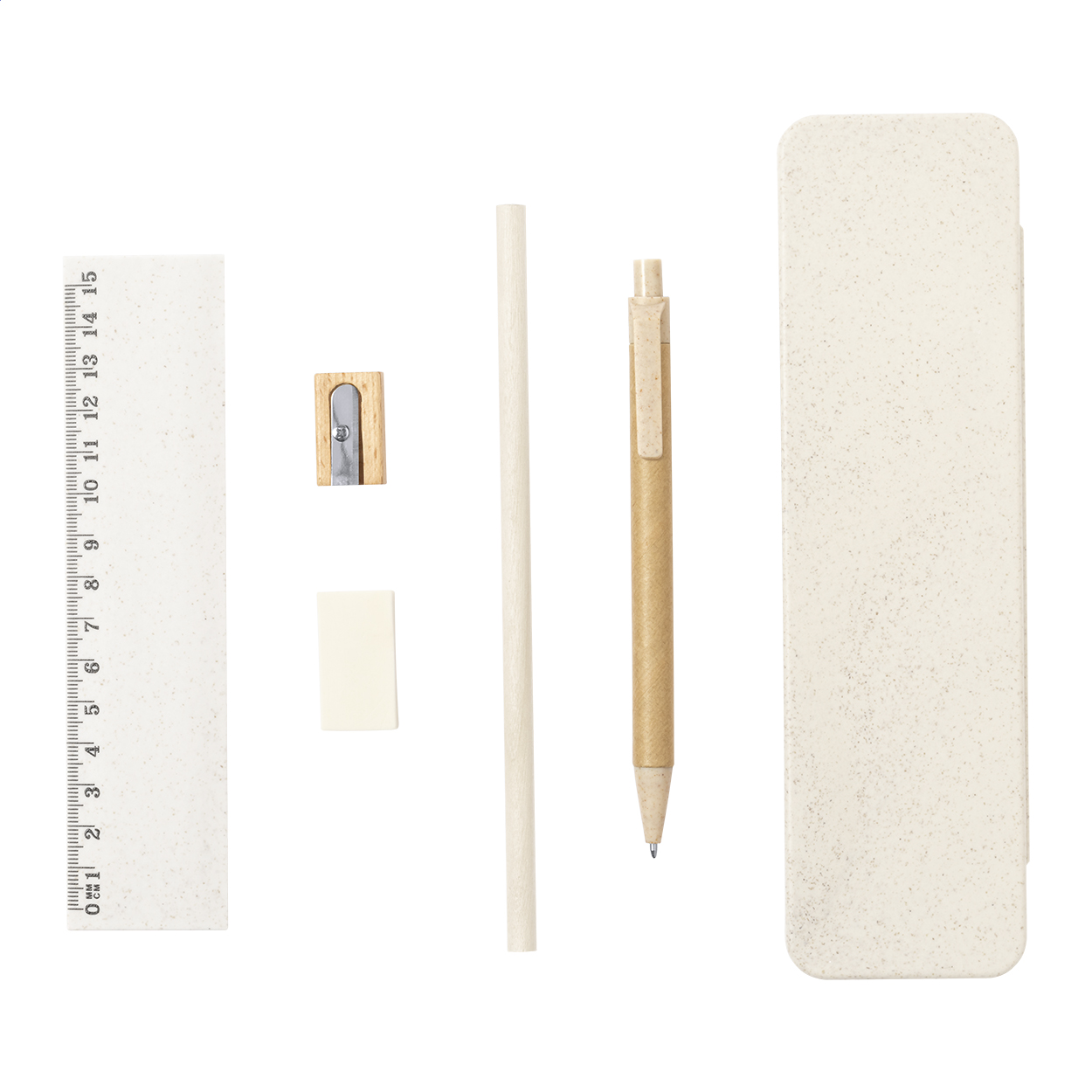 5 db-os írókészlet ökológiai búzaszalma műanyag tokban. 1 fa grafitceruzát, 1 újrahasznosított papírból és búzaszalma műanyagból készült golyóstollat kék tollbetéttel, 15 cm-es vonalzót, 1 fa hegyezőt és 1 radírt tartalmaz.