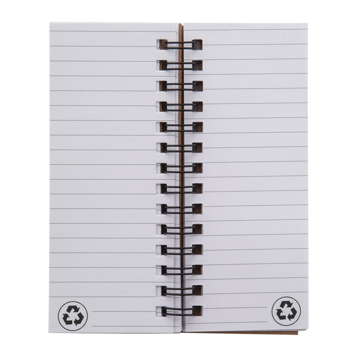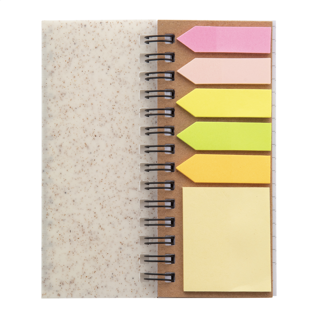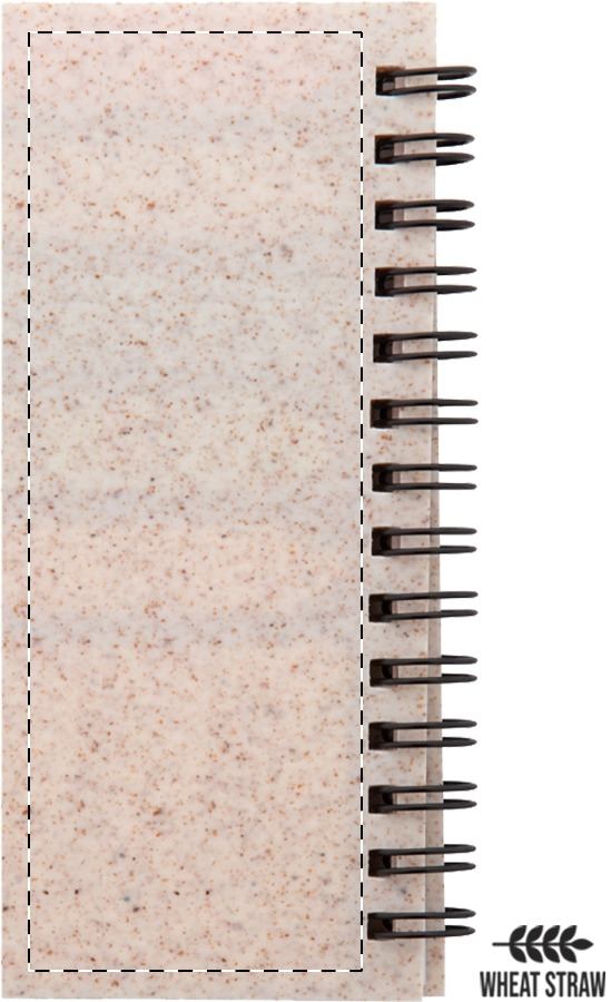 Ökológiai búzaszalma műanyag borítású spirálfüzet 40 vonalas lappal újrahasznosított papírból, 25 öntapadós jegyzetlappal és 125 oldaljelölővel (5 különböző színben). 12 cm-es vonalzóval a borítón.