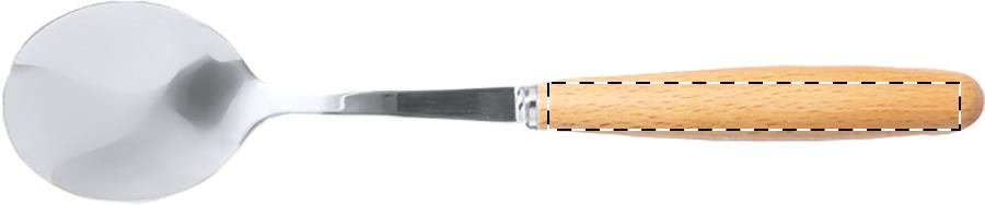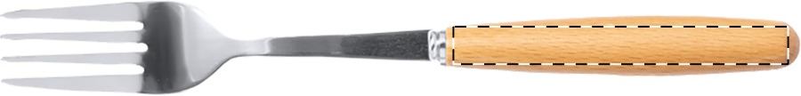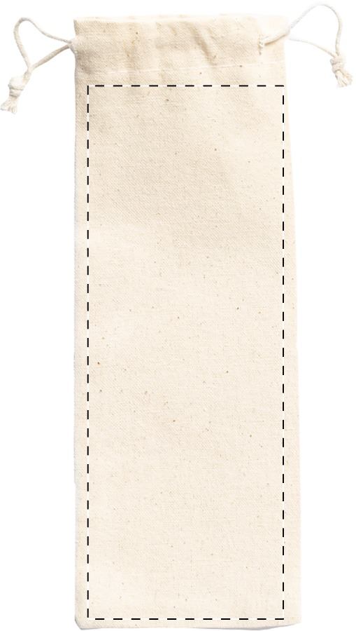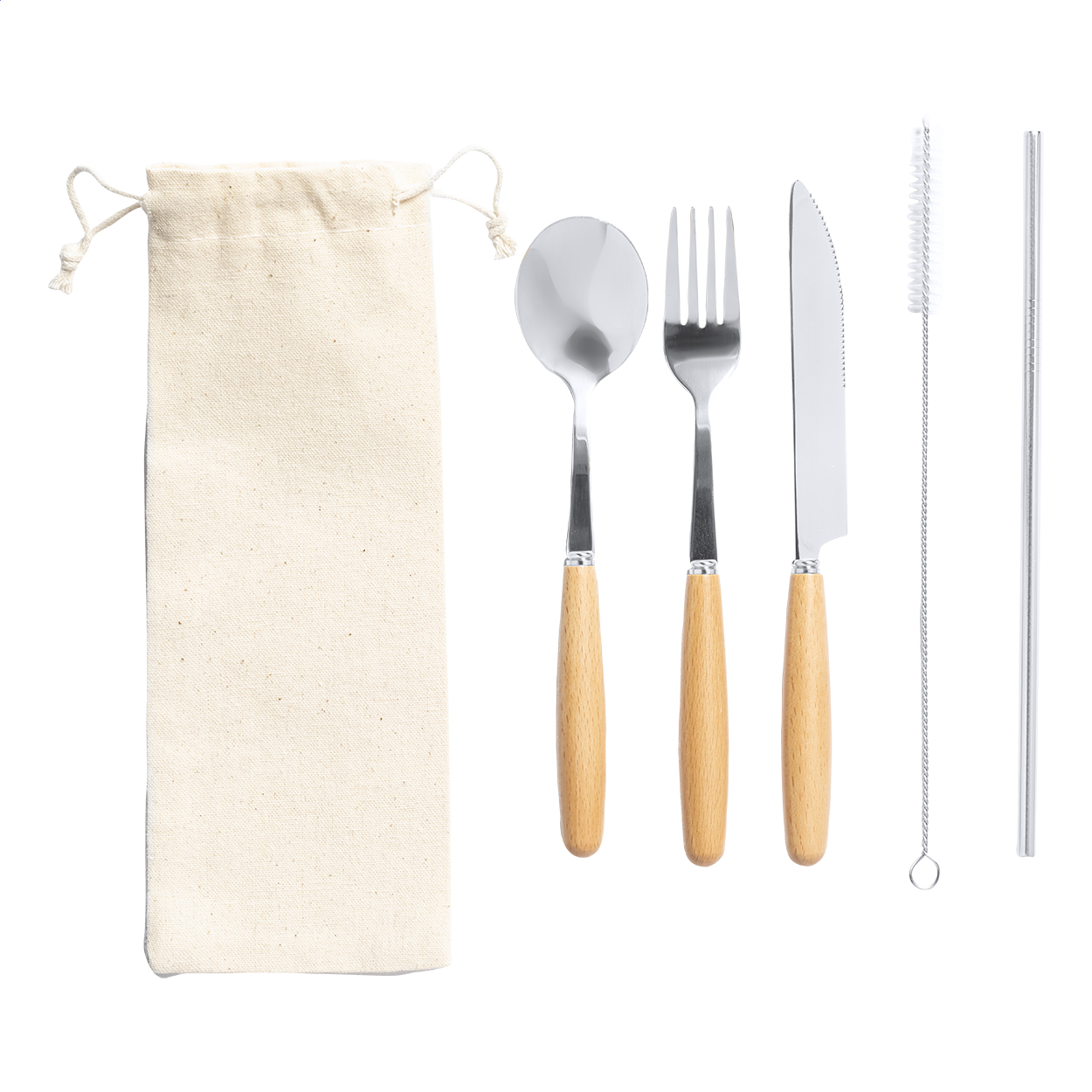 5 db-os rozsdamentes acél evőeszközkészlet fa fogantyúval, pamut zsinóros tasakban. Villát, kést, kanalat, szívószálat és tisztítókefét tartalmaz.