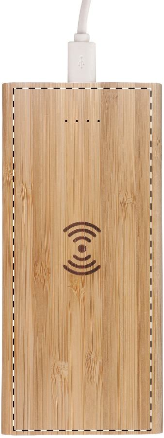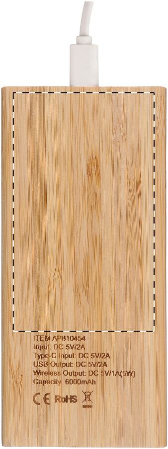 Bambusz USB power bank beépített vezeték nélküli töltővel (5W), 2 porttal és 6000 mAh akkumulátorral. Micro USB-n és USB-C portokon keresztül tölthető. USB töltőkábellel szállítjuk.